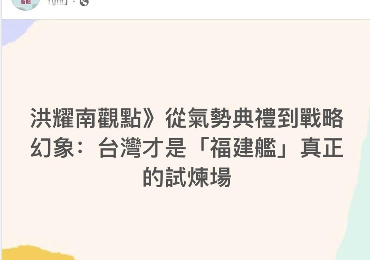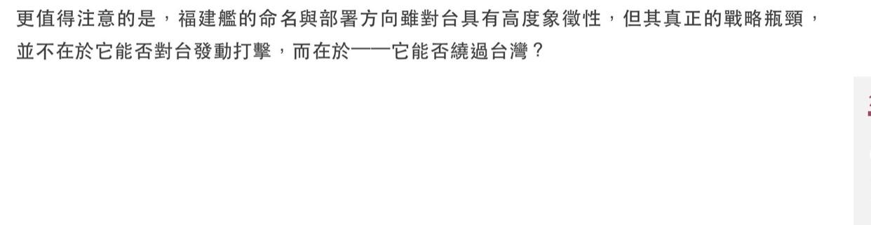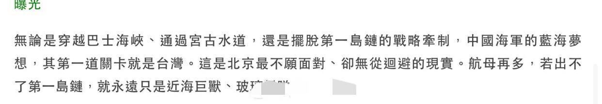 台媒酸道:福建舰航母服役,别看气势典礼惊人,其实只是战略幻象,因为福建舰要出第一岛链去远海大洋是绕不过台湾的,台湾才是福建舰真正的试炼场,你航母再多,如果出不了第一岛链就永远只是近海巨兽、玻璃舰队。