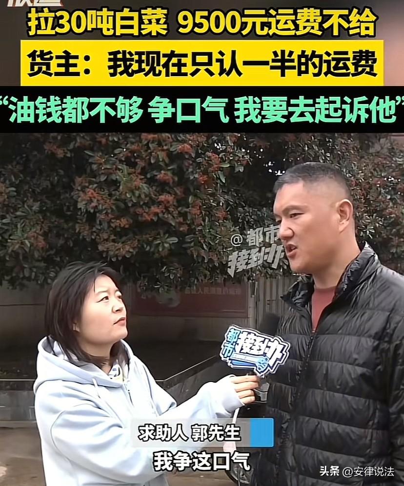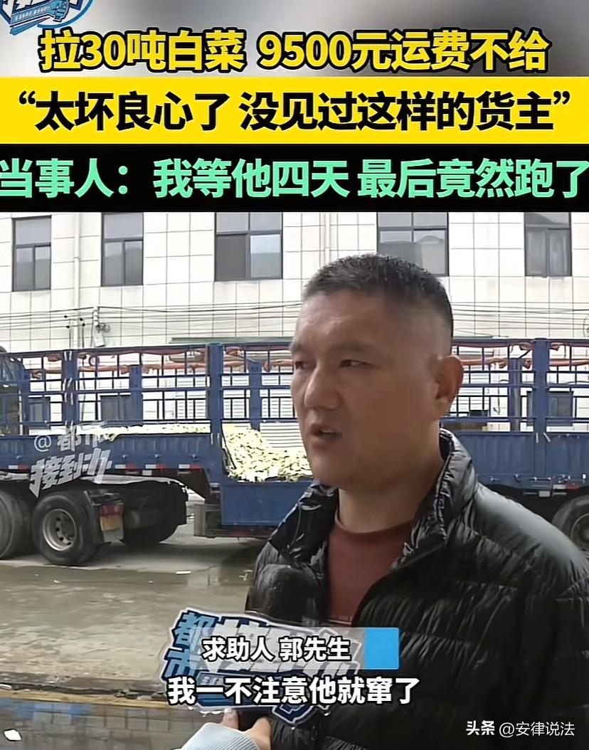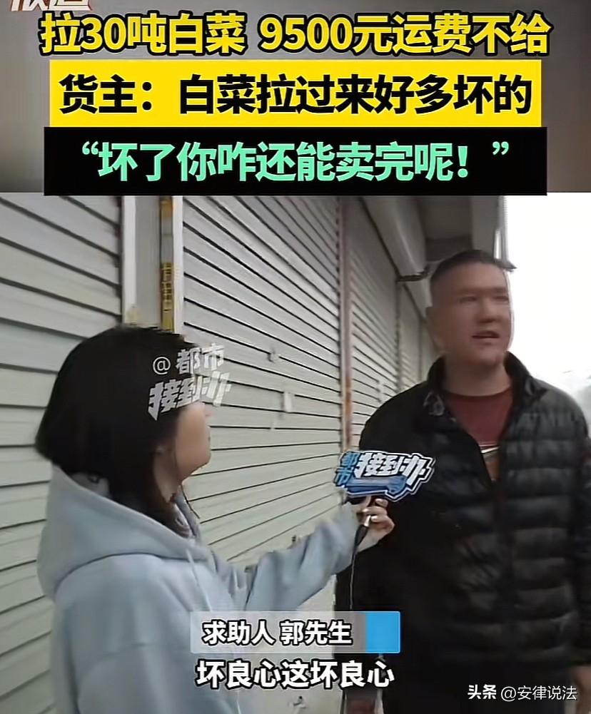 “太坏良心了!”一货车司机连夜帮人从内蒙巴彦淖尔临河拉了30多吨大白菜到开封通许,货主承诺运费9500元,卖完货两天内支付运费。可令货车司机万万没想到的是,一连等了货主4天货主才把白菜卖完,卖完后竟然又说菜不好,不愿意支付运费,最后竟然还跑了! 据悉,郭某是一名大货车司机。 10月30日,郭某帮人从内蒙巴彦淖尔临河拉了30多吨大白菜到开封通许,货主承诺运费9500元,卖完货两天内支付运费。 装了一天车,又连续开了一夜车,郭某最终在规定时间内将货送到目的地。 随后,货主开始卖货。 转眼2天过去了,货主并没有把货卖完,便向郭某提出再卖一天。 郭某也不是那么较真的人,便爽快地答应了货主。 结果,货主又卖了一天还是没有卖完。 郭某想着已经耽误一天时间,而且见货主已经卖得差不多了,便让货主支付运费。但是货主就是不给。 郭某无奈之下选择报警,报警后,见货主当着民警的面承诺再卖一天,一分钱运费也不会少,便又给了货主一天的时间。 货主又卖了一天,最终把货卖完了,在支付运费时,称其侄子管着账呢,让郭某等几分钟,等其侄子来结账。 结果,郭某等了很久没有等到货主的侄子,还发现货主趁自己不注意,溜了! 郭某怒了,连忙联系货主向货主讨要运费。 可令郭某万万没想到的是,货主却又表示郭某拉过来的白菜坏了很多,反而要求郭某负责。 “好好的白菜,而且都已经卖完了,怎么就坏了?”“况且自己只负责运输,就算白菜不好,你也应该找代办!”郭某懵了,与货主理论未果后,便向媒体求助。 记者采访中,郭某讲述了事情的经过并直言:“从来没有见过这样的货主,太坏良心了!” 而货主依然坚称白菜坏了!还表示自己损失了一万多块钱。 对此,郭某表示30多吨白菜总共1万多块钱,货主卖的白菜有7毛一斤的、有6.5毛一斤的,还有5.5毛一斤的,30多吨白菜,就算按5.5毛一斤最起码卖了3万多块钱。 随后,经过记者调解,货主终于松口,表示自己认运费,但只认一半。 但是郭某不能接受,表示货主承担一半运费,连自己的油钱都不够,自己坚决不同意,不行自己就去法院起诉货主。 那从法律上该如何看待此事呢? 货主找人帮忙收购大白菜,而后又找郭某托运。分别与代办之间形成代理合同,与郭某形成货运合同关系。 《民法典》第465条规定,依法成立的合同,受法律保护。依法成立的合同,仅对当事人具有法律约束力,但是法律另有规定的除外。 第832条规定,承运人对运输过程中货物的毁损、灭失承担赔偿责任。但是,承运人证明货物的毁损、灭失是因不可抗力、货物本身的自然性质或者合理损耗以及托运人、收货人的过错造成的,不承担赔偿责任。 根据合同的相对性,货主认为货物存在质量问题理应找代办人负责,除非能够证明货物是运输过程中因郭某的过错导致损坏,才可以要求郭某担责。 《民法典》第509条规定:当事人应当按照约定全面履行自己的义务;当事人应当遵循诚信原则,根据合同的性质、目的和交易习惯履行通知、协助、保密等义务。 第577条规定:当事人一方不履行合同义务或者履行合同义务不符合约定的,应当承担继续履行、采取补救措施或者赔偿损失等违约责任。 货主不按照约定支付郭某的运费,如果不能证明郭某的过错导致货物在运输途中损坏,已经构成违约。除了要支付运费外,还需要赔偿郭某的损失。 这事您怎么看?欢迎在评论区留言,与大家一起交流您的看法! ------ 关注@安律说法 案例中看人生百态,法律中寻破局之法!