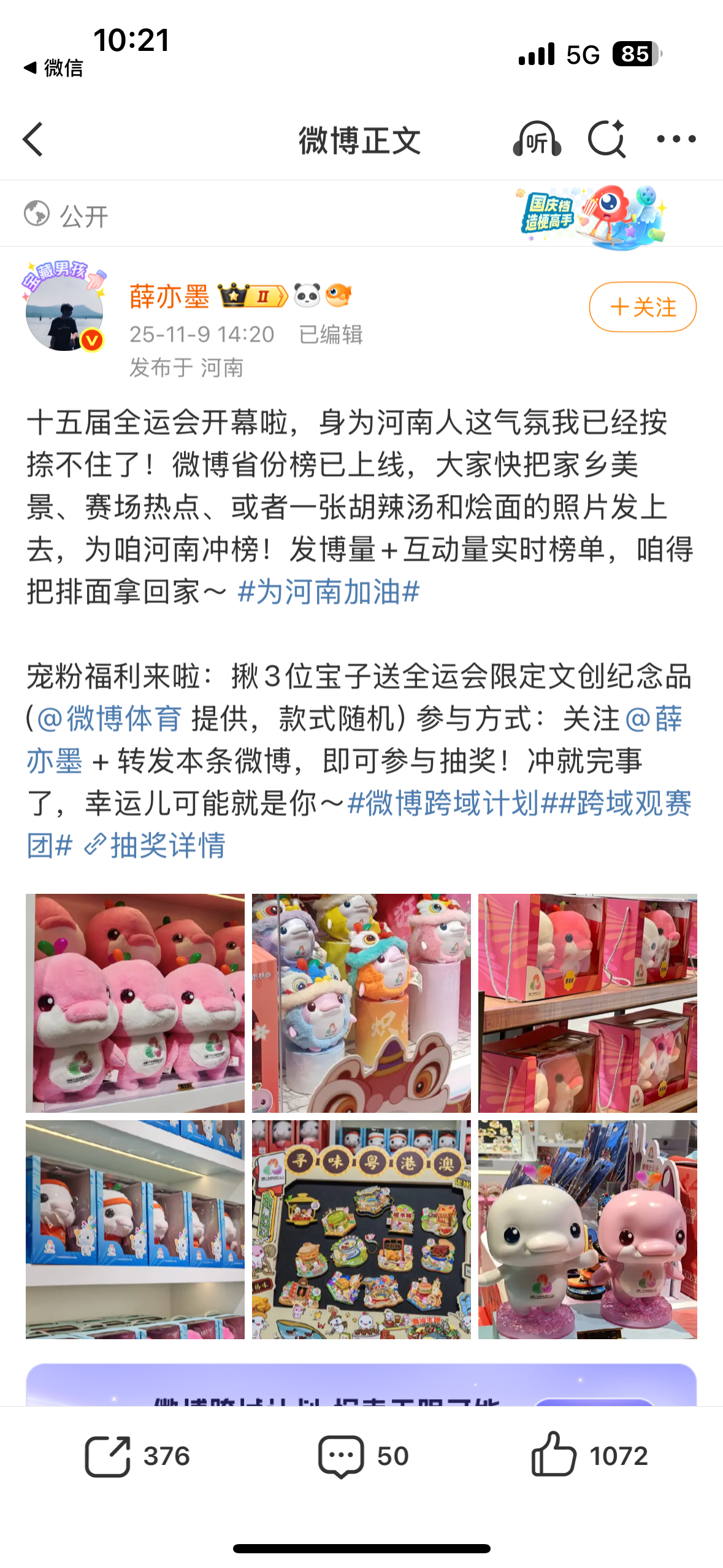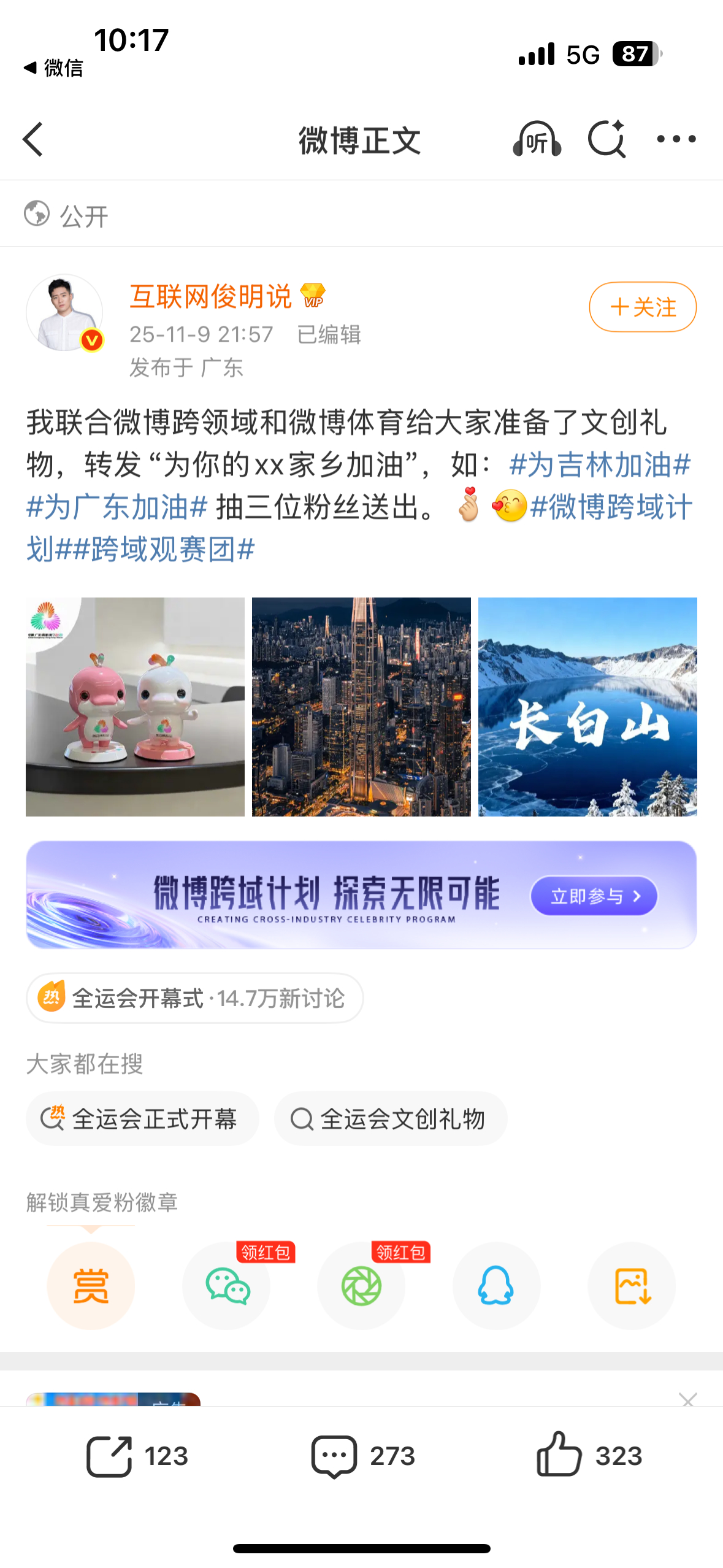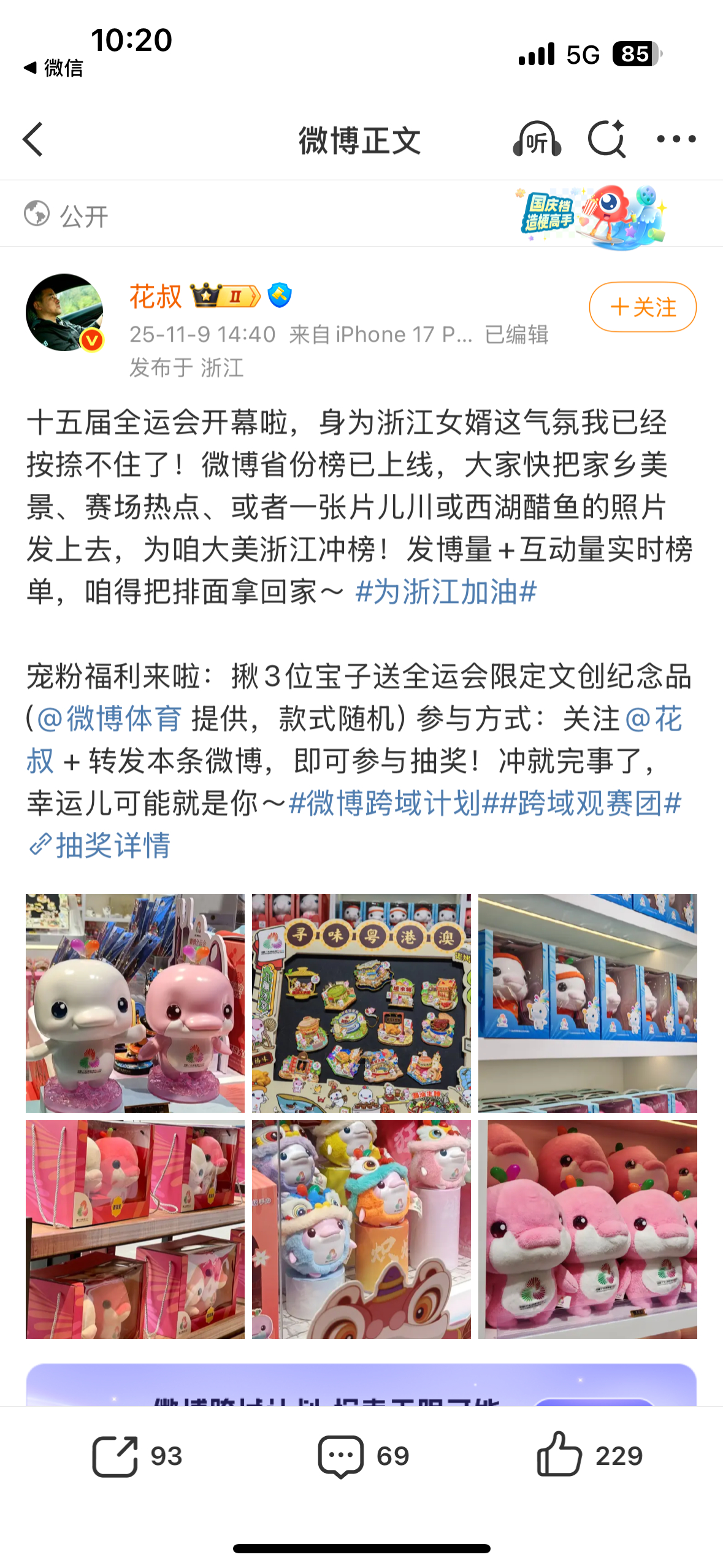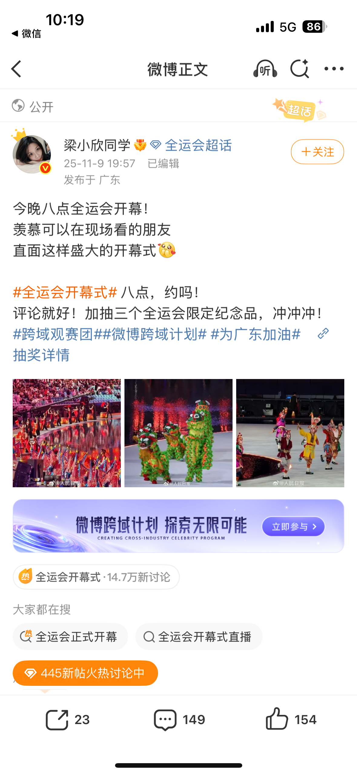 全运会正式开幕,开幕日全省份榜上广东队为广东加油 占据榜首,河北上海北京紧随其后。等博主送出全运吉祥物大湾鸡,号召大家一起为家乡加油![打call]