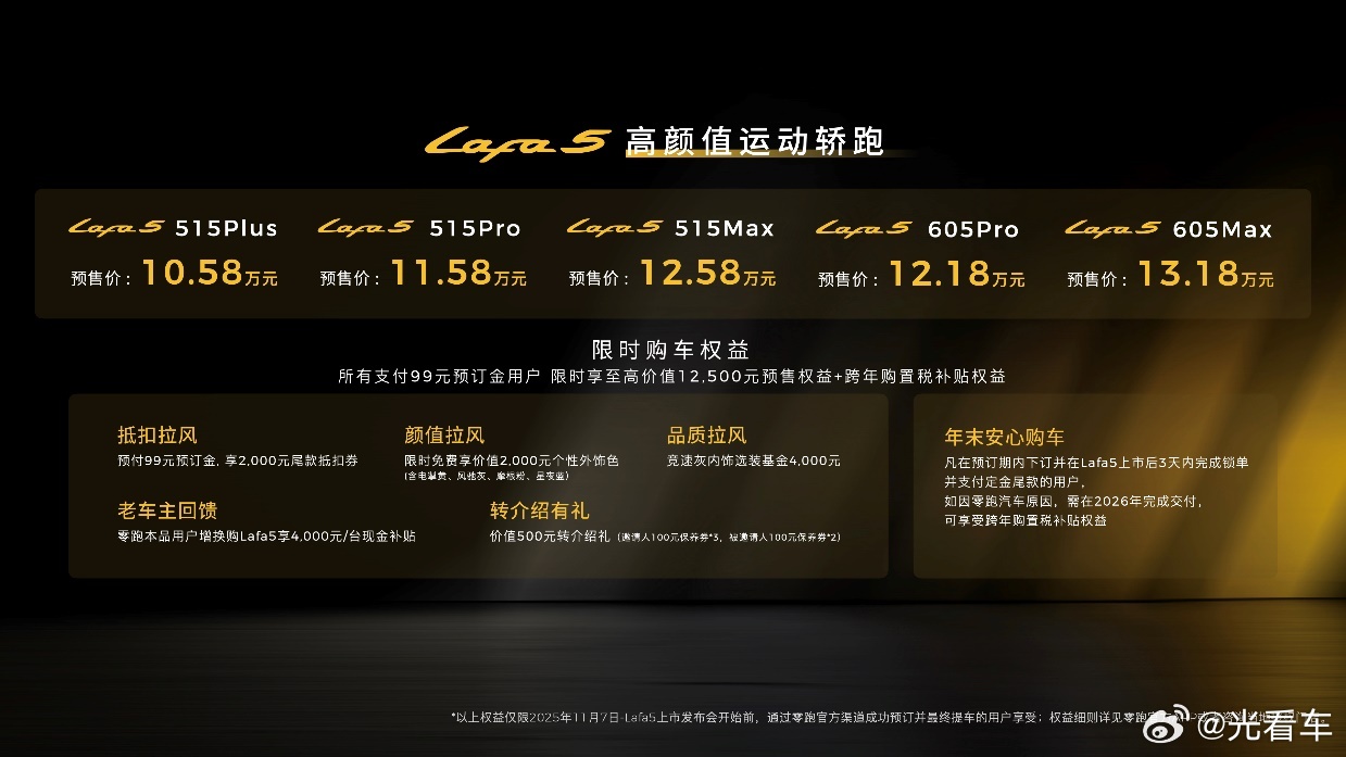 6.年末安心购车:凡在预订期内下订并在Lafa5上市后3天内完成锁单并支付定金尾款的用户,如因零跑汽车原因,需在2026年完成交付,可享受跨年购置税补贴权益;