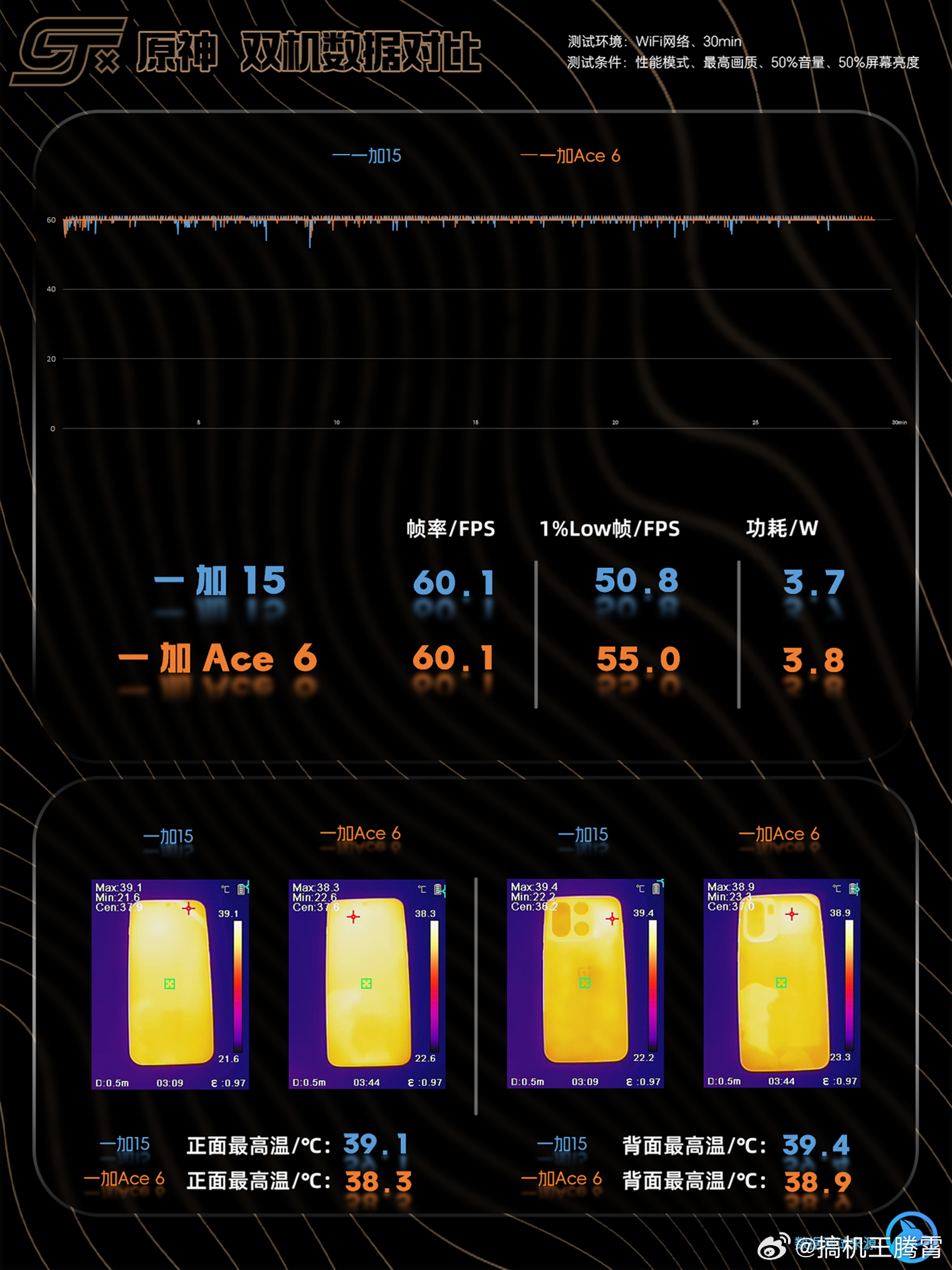 游戏方面,同样室温25℃左右,通过PerfDog实测,王者和原神两款游戏基本拉不开差距,都能轻松跑满,区别主要还集中在星铁部分,加加15都能顶着满帧跑,整体来说比较稳,而Ace6前期很稳,后期伴随机身升温会在45帧和60帧之间来回切换,如果喜欢玩重载游戏的话,那肯定还是第五代骁龙8至尊版更稳,但如果玩的都是一些热门手游,骁龙8至尊版就是性价比之选。