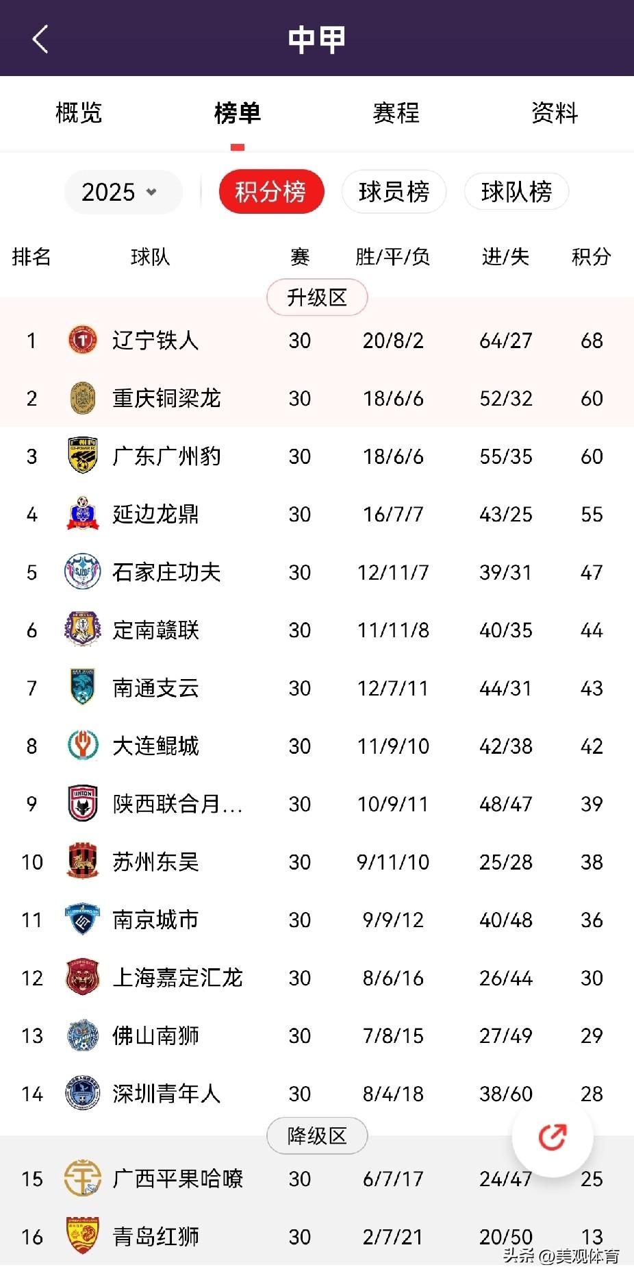 中国足球甲级联赛积分榜(终极版) 江苏省的三支球队南通支云、苏州东吴、南京城市分别获得第7、10、11名。 广西壮族自治区唯一的一支中甲球队惨遭降级。 青岛红狮已经提前N轮降级,末轮只是给提前拿到的“降级证书”盖上了确认章。