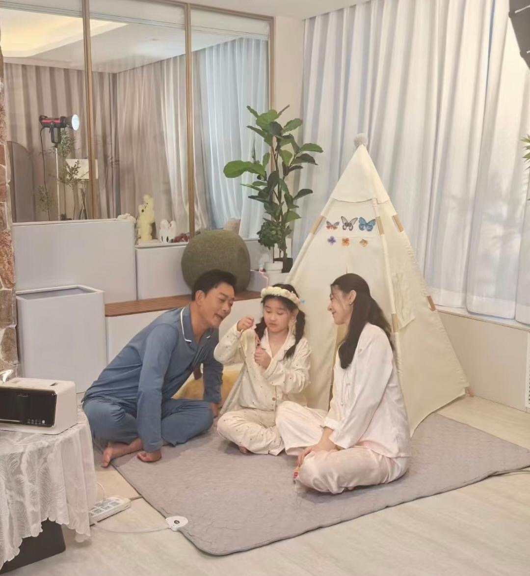 52岁黄海冰和老婆女儿一起在客厅开睡衣派对,一家人感情和睦。女儿扎着麻花辫,长相灵动可爱,颜值挺高的。