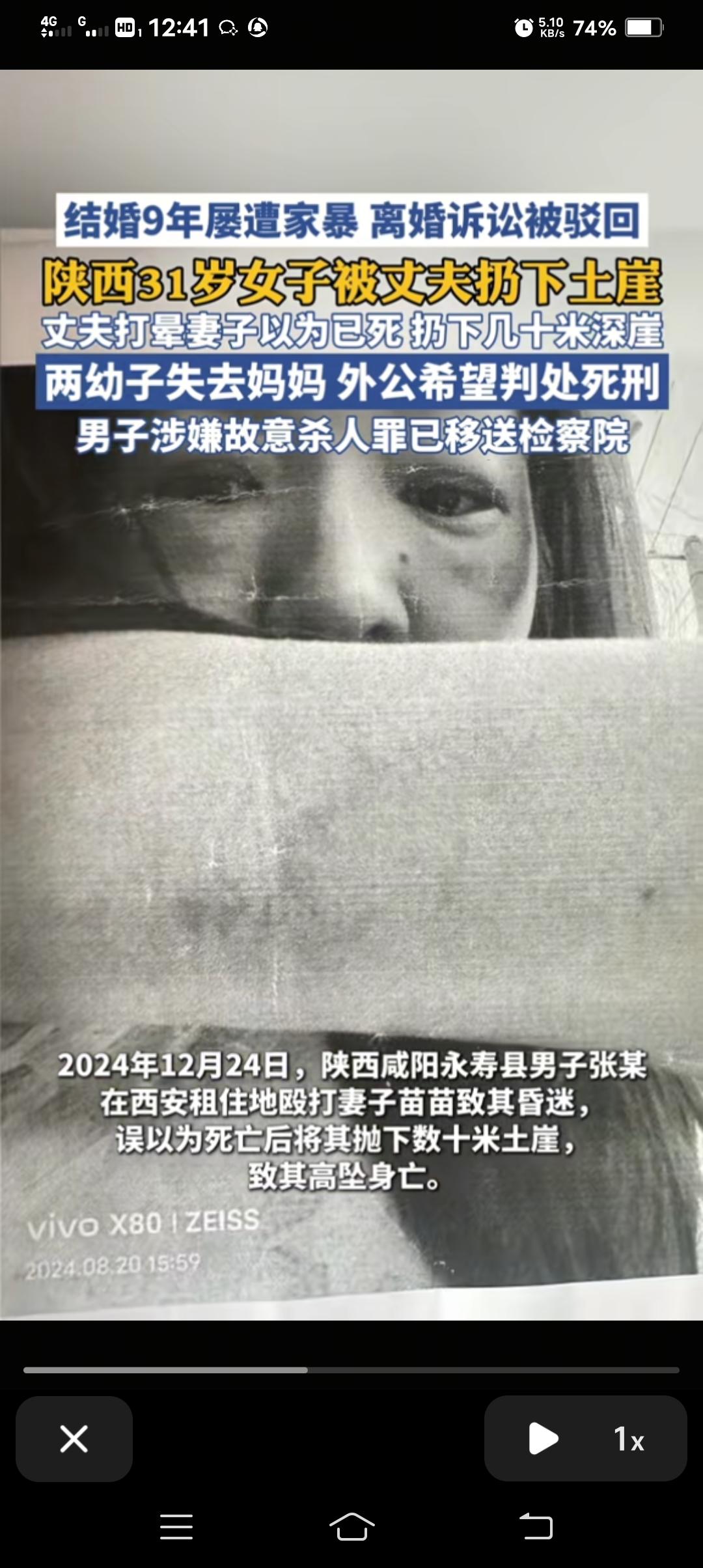 陕西31岁女子被丈夫打晕后扔下土崖致其身亡。 这曾是一对外人看好的夫妻,然而对于受害人苗苗来说,婚姻对她就是噩梦的开始,丈夫多次家暴,9年的婚姻生活,唯一让她牵挂的就是她的两个孩子,这也就成了她多次原谅丈夫的原因,她就是想让孩子有个家。 她也曾挣扎过,可是起诉离婚不但被驳回,最终连自己的命都没了,丈夫最后一次把她打晕后丢到了几十米的土崖下最终身亡。 婚姻给了她什么?家暴背后女人的无助,为了给孩子一个完整的家选择一次次忍耐,然而在丈夫的眼里,何曾把她当成妻子,2个孩子的妈妈,要不然怎能下手如此狠,甚至想丢弃东西一样把她丢掉,可曾想过这是一条人命啊! 这样的人就该严惩,苗苗的家属人表示,不要任何赔偿,只要求死刑。