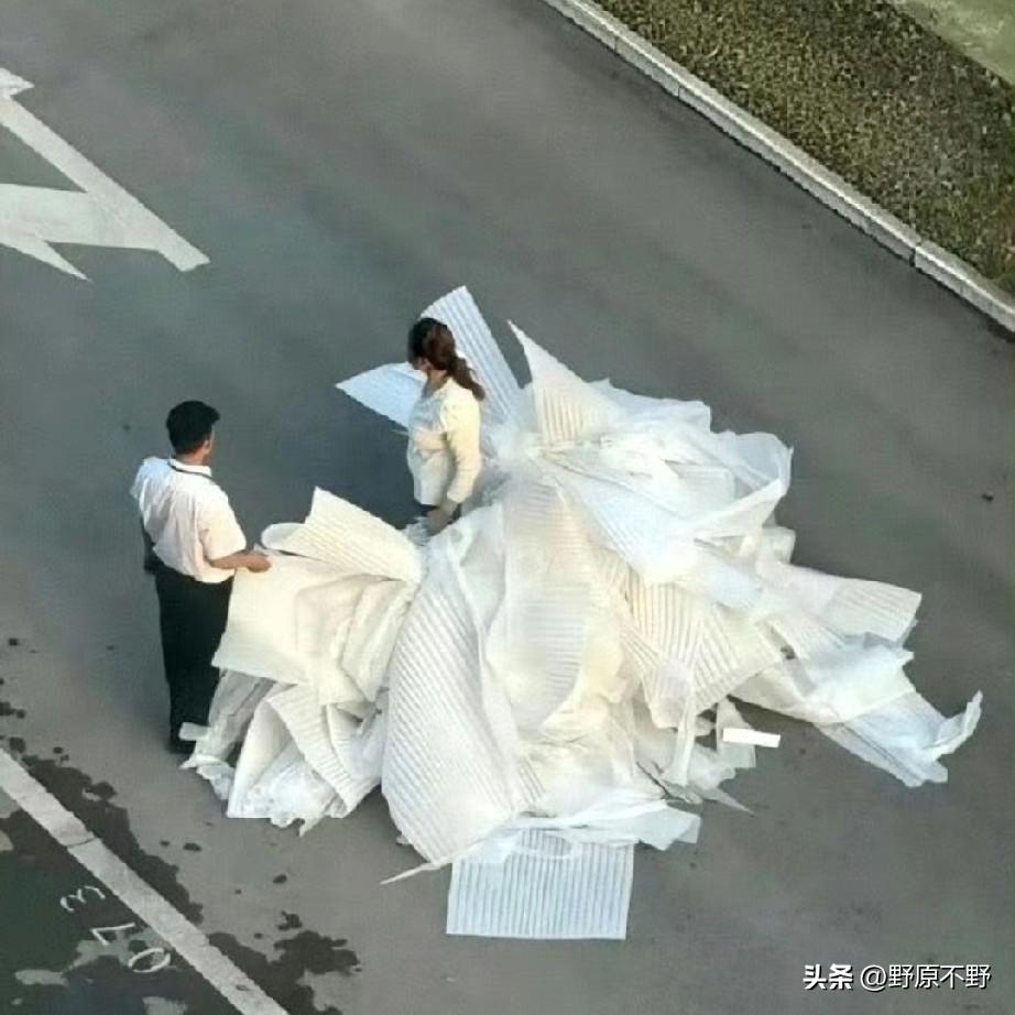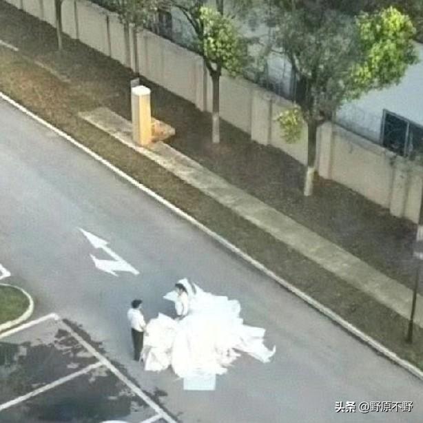 不仔细看还以为是在求婚。 镜头拉近,发现是保安大哥和保洁阿姨。 每个角度和每个人看到的都不一样啊[尬笑] 而且两个人上身都是白衣服,男的提着裙摆,旁边的塑料也是很争气,有模有样的充当裙摆和头纱。 晃眼看,这裙子还挺好看的[捂脸]