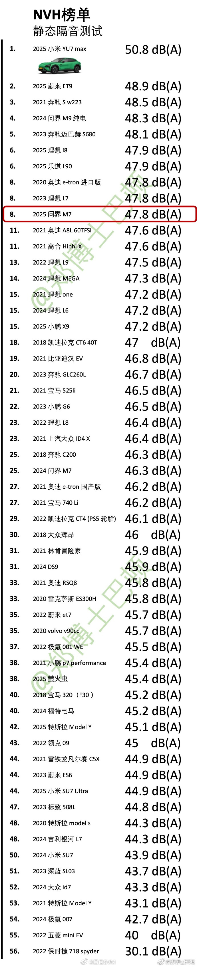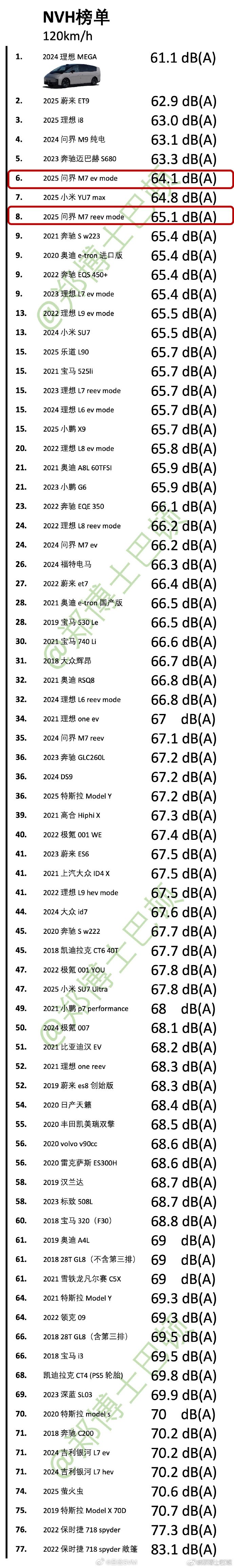 理解这些,再来看M7。它相当不容易。价格不占优势的情况下,依然在120km/h时速测试时来到榜单第6名。