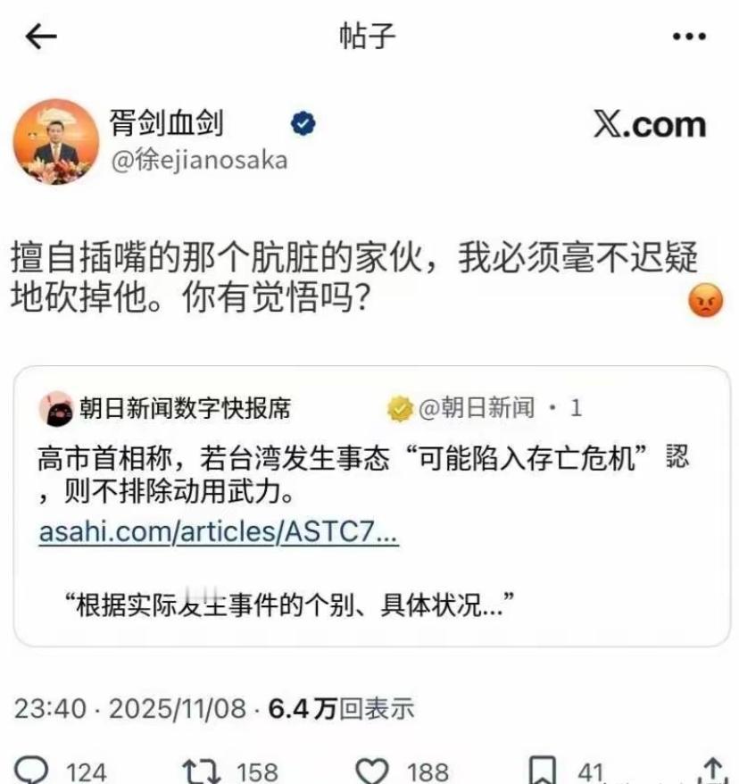 看得出薛剑的评论戳到了日本的痛处,明明是中国的内政,日本非要横插一脚,公然挑衅中国的主权,还不允许中国提出抗议,以为中国还是上个世纪前半叶可以任人宰割凌辱的中国吗?!   中国人不是吓大的,面对挑衅,我们不会沉默不语,也绝不会步步后退。   11月7日,东京政界的那句“存亡危机事态”,不是失言,是精心设计,是带着恶意的试探。   高市早苗在预算委员会上公然叫嚣,一旦台海有事,日本将行使集体自卫权,军事介入。   这不是空喊口号,这是把枪口对准中国的宣告。她早已不是第一次在台湾问题上玩火,但这一次,她点燃的不是火苗,而是炸药。   日本的算盘打得响。APEC会议上刚承诺“尊重一个中国”,转头就与台当局代表会面,照片上传社交媒体时的微笑,根本不是外交礼仪,而是挑衅的笑容。   她清楚知道中国的红线在哪儿,却故意踩。她不是不知道后果,只是赌中国不会反应。结果呢,薛剑一句话,把他们的伪善撕了个粉碎。   “对于擅自插手的那肮脏的首级,只能毫不犹豫地斩下。”这句话在中国人听来,刚正不阿,在日本人眼中却像惊雷炸响。   他们不是怕话本身,他们怕的是这句话背后代表的态度,中国人不再忍让、不再委曲求全、不再容忍你们在我们头上作威作福的时代来了。   日本有些人还活在幻想里,以为这个世界还是他们可以撒野的战前亚洲。以为中国还是那个列强分割下的半殖民地。   以为外交辞令只能是隐忍克制、永不动声色。可他们忘了,现在的中国是有底气的中国,是不再容忍羞辱的中国,是已经站起来的中国。   他们说薛剑“威胁外交”,说他“挑衅和平”。可是谁先破坏和平?是谁先插手中国内政?   谁在钓鱼岛部署攻击型无人机?谁在白皮书中叫嚣“中国是最大战略挑战”?   谁在强推修宪,妄图洗白军国主义的过往?到底是谁在挑衅,谁在威胁,谁在玩火,他们自己心里最清楚。   日本政府随后通过外交渠道向中方抗议,试图把自己打扮成“受害者”。   可中方没有退让,外交部发言人林剑在11月10日的记者会上直言不讳,日方相关言论“性质和影响极其恶劣”,严重违反中日政治共识,严重挑战国际关系基本准则。   台湾是中国的台湾,容不得任何外部势力插手。   他们说薛剑的语言过激,却不敢正面回应高市早苗的危险言论。   为什么?因为他们知道,真正让局势危险的,是日本右翼政治势力的野心。   他们要修宪、要扩军、要军事正常化,台海只是他们制造外部敌人的借口。   他们根本不关心台湾的未来,他们只关心自己的政权延续。   鸠山由纪夫的声音虽然微弱,但却清醒。他指出高市是在“煽动战争”,是在将日本社会拖入不归路。他提醒日本人,不要被政客牺牲。   他的声音是理智的火花,是对战争记忆尚存的呼唤。但日本政坛中,这样的声音太少了,太弱了,几乎淹没在右翼的鼓噪中。   日本社会不是铁板一块。冲绳民众九成以上反对军事介入台海,因为他们才是真正理解战争代价的一群人。   他们知道,一旦局势失控,首先承受后果的,永远是平民百姓。可政客们不在乎,他们只看选票、看军火合同、看美国的表情。   美国当然不会缺席。日本的每一次动作,都在配合“印太战略”的棋盘布局。美日勾连,正在把台海推向危险边缘。   他们以为可以用“存亡危机事态”框架,将日本绑进美国的车轮,把台海变成新的前线。可他们忘了,中国不是伊拉克,不是南联盟,更不是他们能随意摆布的棋子。   中国不会主动挑事,但也绝不会怕事。我们已经多次强调,台湾问题是中国内政,是中国主权的核心,不容干涉,不容挑战,不容交易。   谁胆敢越界,必将遭到坚决还击。外交,是讲理的艺术,但当对方不讲理时,中国也不会永远讲理。   薛剑删掉了那条微博,但他的话,已经响彻中日之间。他说出了中国人的愤怒,也说出了我们的底线。   有些人试图将其妖魔化,却无法掩盖其中最本质的事实:中国不再是那个只能靠沉默换平安的国家。   2025年,是台湾光复80周年。中国人不会忘记那段历史,更不会允许历史倒退。   日本如果还有一点历史羞耻感,就该闭上嘴,好好反思,而不是变本加厉、故意挑衅。   我们不是要战争,我们要的是尊重,是和平,是主权完整被真正尊重的和平。   如今的局势,已经不是单纯的外交口水战,而是战略博弈的真实角力。   中方已经在多个层面展开反制,外交上在联合国提出琉球原住民问题,军事上加大台海演训频次,经济上也在布局对日企业的精准反制。   这是全方位、立体化的回应,是中国作为一个大国的坚定与冷静。   日本若执意将“存亡危机事态”法制化,那就等同于把对台干预写进国家战略。   这不只是挑衅中国,而是与整个东亚和平为敌。中国不会坐视不理,到时候不会只是斩词,而是斩行动。