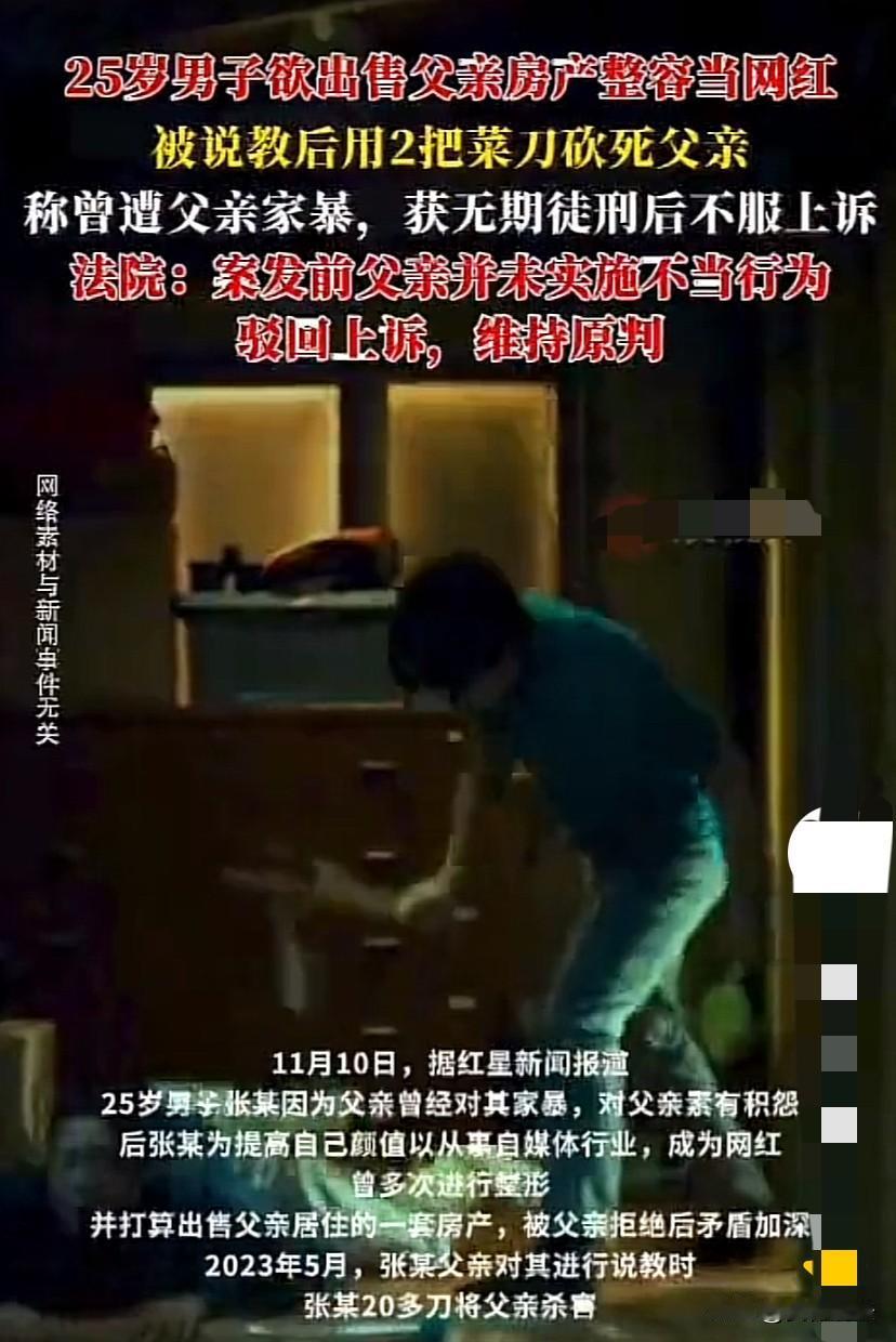 安徽,25岁男子欲出售自己父亲的房子然后整容当网红,因被自己父亲拒绝、说教,竟然趁自己父亲不备,用事先准备好的菜刀,连砍自己父亲头面部20多刀,而后又换了一把刀割自己父亲的颈部,导致自己父亲当场死亡。事后,一审法院以故意杀人罪判处男子无期徒刑,男子表示不服,提起上诉。二审法院判了! 据悉,25岁男子张某的父亲脾气暴躁、喜欢说教,在张某小时候,还有过家暴行为,因而与张某等人的关系一直很紧张。 2015年,张某的父母离婚,时年仅17岁的张某开始了自媒体生涯。随后,张某为了提高自己的颜值,多次进行整形,为了继续提升形象,还向自己的父亲提出卖掉父亲的房子。 张某的父亲闻言当即便拒绝了张某的请求而后又像往常一样对张某说教了一番。这也让张某更加怨恨自己的父亲。 2023年5月,张某产生了杀害父亲的想法。随后便准备了一把菜刀,并多次在网上检索相关的信息,预谋行凶。 当月,张某的父亲再次到张某家中,对张某说教时,张某便趁自己的父亲不注意,拿出事先准备好的菜刀就朝自己父亲的头面部招呼。 张某一连砍了自己父亲头面部20多刀后,又换了一把菜刀割了自己父亲的颈部,最终导致自己父亲当场死亡。 事后,张某清洗了菜刀,还清理了自己父亲尸体周边及走道的血迹,企图掩盖犯罪痕迹。 不过,随后张某又将此事告诉了自己的母亲,张某的母亲劝张某主动报警未果后,便报了警。 张某得知自己的母亲报警并没有逃跑,随后,警方赶到现场将张某抓获。 《刑法》第232条规定,故意杀人的,处死刑、无期徒刑或者10年以上有期徒刑。 张某主观上预谋杀害自己的父亲,客观上持刀将自己父亲杀害,毋庸置疑已经构成故意杀人罪。 《关于贯彻宽严相济刑事政策的若干意见》的相关规定,对于因恋爱、婚姻、家庭、邻里纠纷等民间矛盾激化引发的犯罪,慎用死刑。 考虑本案系家庭内部纠纷引发矛盾激发所致,张某如实供述了自己的罪行,属于坦白。张某父亲一方的亲人也选择原谅了张某,一审法院最终判决张某犯故意杀人罪,无期徒刑。 一审判决后,张某表示不服提起上诉,张某不否认自己杀害父亲的事实,但是认为一审法院的量刑过重,表示自己还属于自首,自己父亲经常对自己实施脱离现实的说教、打骂存在刑法意义上的过错。 《刑法》第67条第1款规定,犯罪以后自动投案,如实供述自己的罪行的,是自首。对于自首的犯罪分子,可以从轻或者减轻处罚。其中,犯罪较轻的,可以免除处罚。 需要满足自动投案和如实供述主要犯罪事实这两个条件,才算自首。 具体到本案,二审法院认为,张某并非主动投案,而是在家人的规劝以及报案下才归案,不宜认定为自动投案,不属于自首。 刑法意义上的被害人过错是指被害人出于主观上的过错实施了错误或不当的行为,且该行为违背了法律或者社会公序良俗、伦理规范等,侵犯了被告人的合法权益或者公共利益,造成较为严重的影响或损害,为常人所不能容忍,客观上激发了犯罪行为的发生。 具体到本案,二审法院认为虽然张某的父亲虽然脾气暴躁、喜欢说教在张某小时候还曾有过家暴行为,但是案发前并没有实施违反犯罪行为或者存在明显不当行为,作为长辈且是张某的父亲,即便在日常生活中存在言语不当或者轻微肢体打击行为也达不到刑法意义上的过错。 二审法院最终认为一审判决并无不当,最终驳回了张某的上诉,维持原判。 这事您怎么看?欢迎在评论区留言,与大家一起交流您的看法! ------ 关注@安律说法 案例中看人生百态,法律中寻破局之法!
