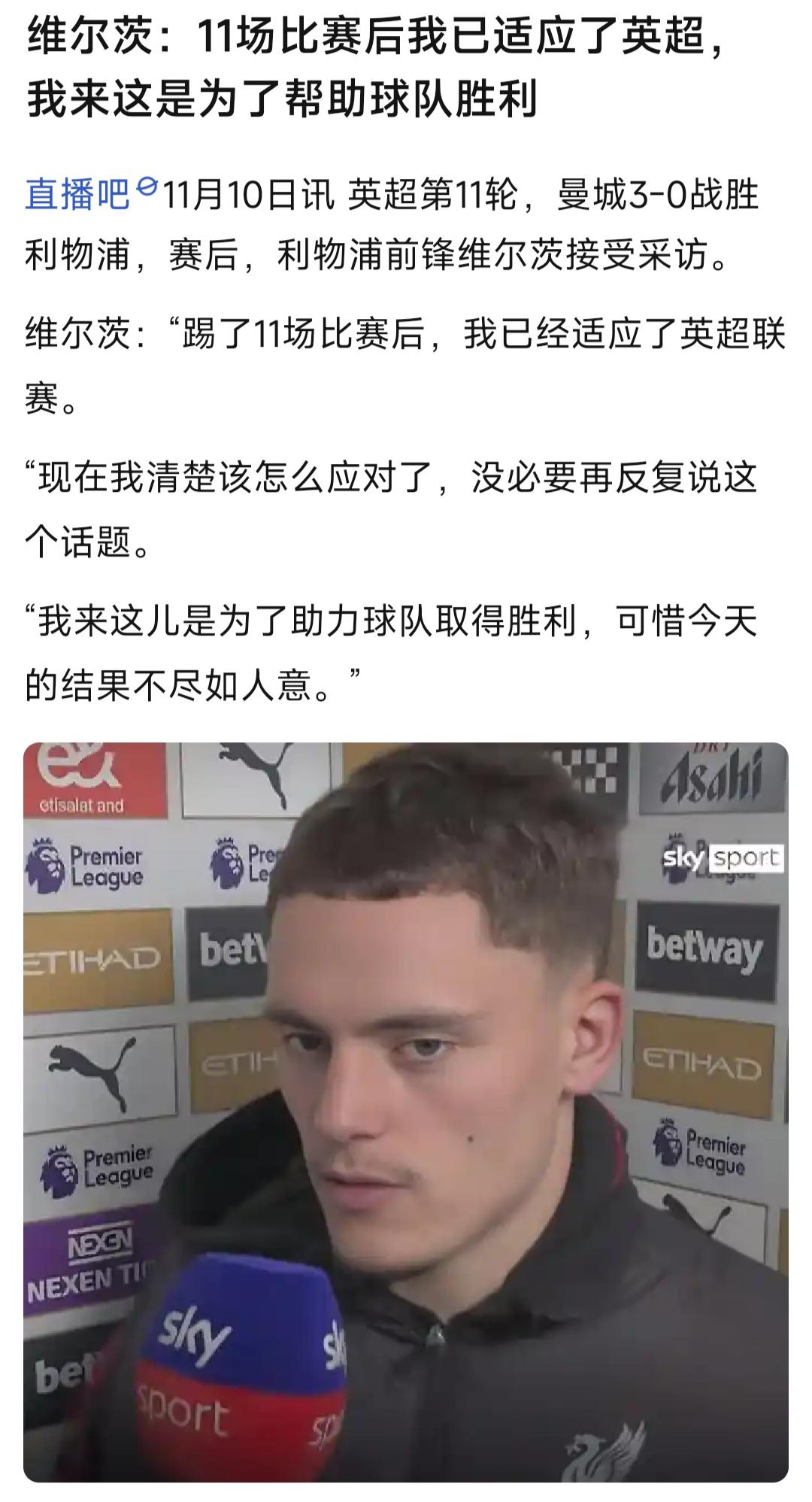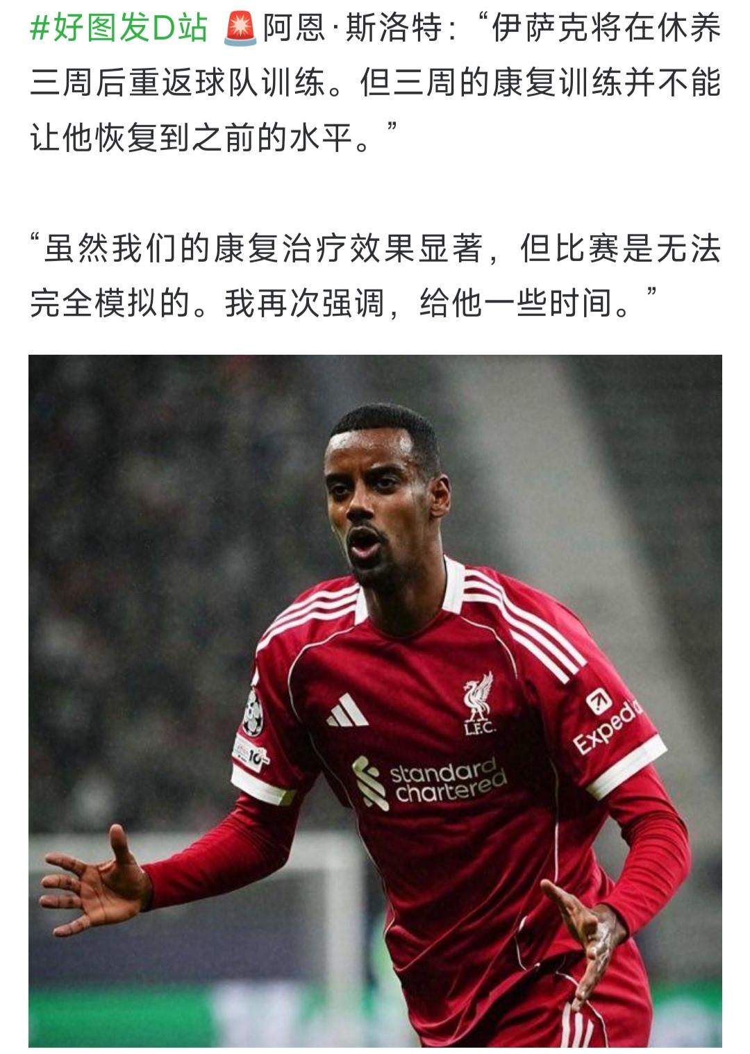 三个新闻一起看,利物浦球迷崩溃了,英超其他球迷非常开心! 斯洛特说0-3落后,反而看到了一支渴望扳平比分的球队,问题是利物浦也没扳平啊.... 维尔茨说他踢了11场英超比赛,已经适应这里,来利物浦是为了帮利物浦胜利.... 还在伊萨克的伤病,说是三周康复训练还没有恢复,马上半个赛季都踢完了.... 我记得去年利物浦球迷好爽,每一周都赢球,其他豪门每周都输球,今年反过来啦。 其实大家也不是讨厌利物浦,只是这种情况过两年轮到阿森纳,五年后曼联也会遭遇的。[捂脸][笑哭]