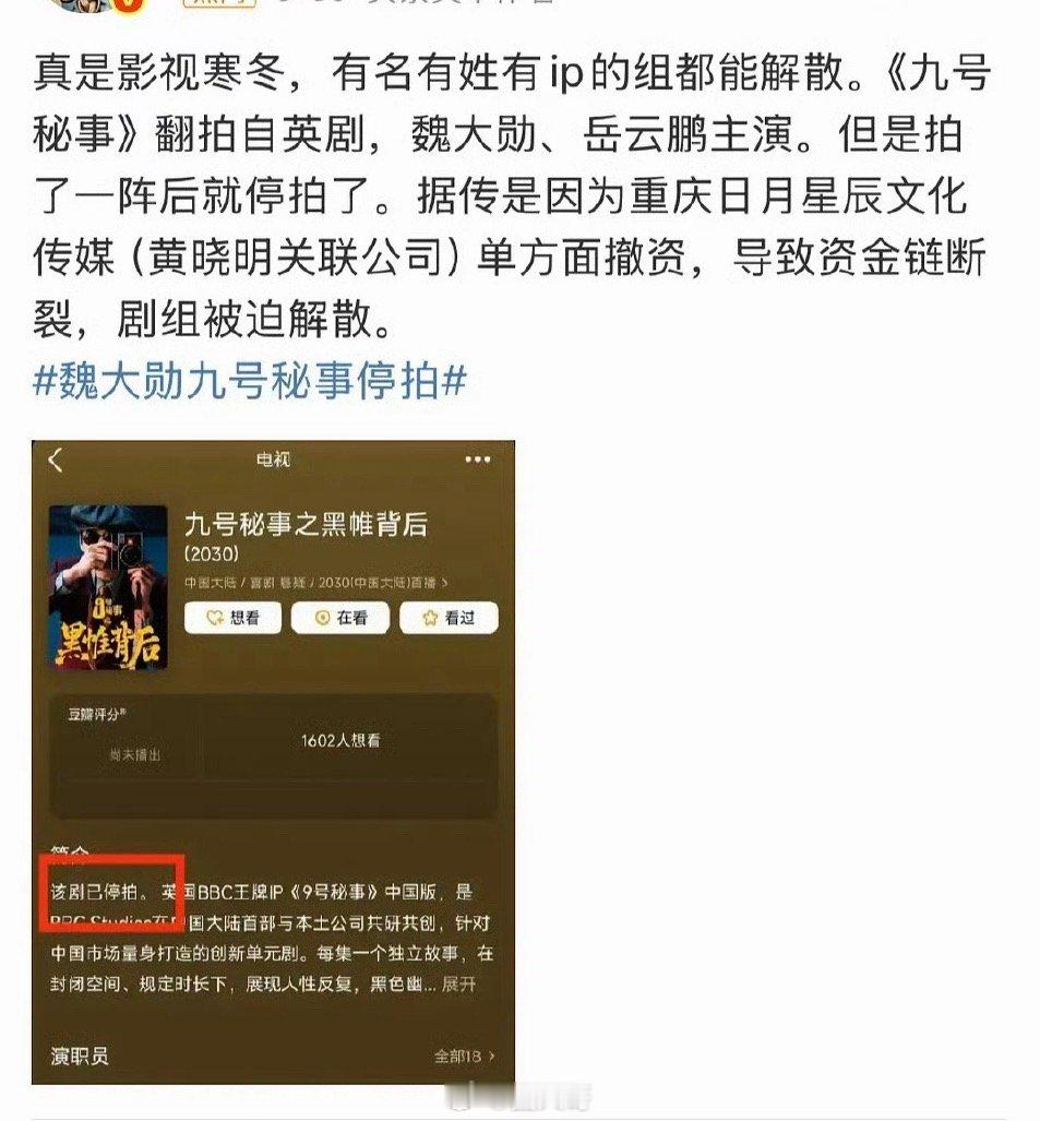 现在魏大勋《九号秘事》和陈哲远吴谨言《江山为聘》也停拍了。