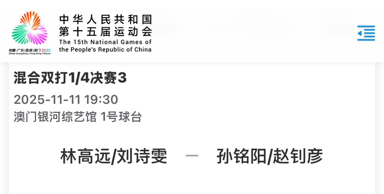 11.11 19:30 T1林高远/刘诗雯VS赵钊彦/孙铭阳