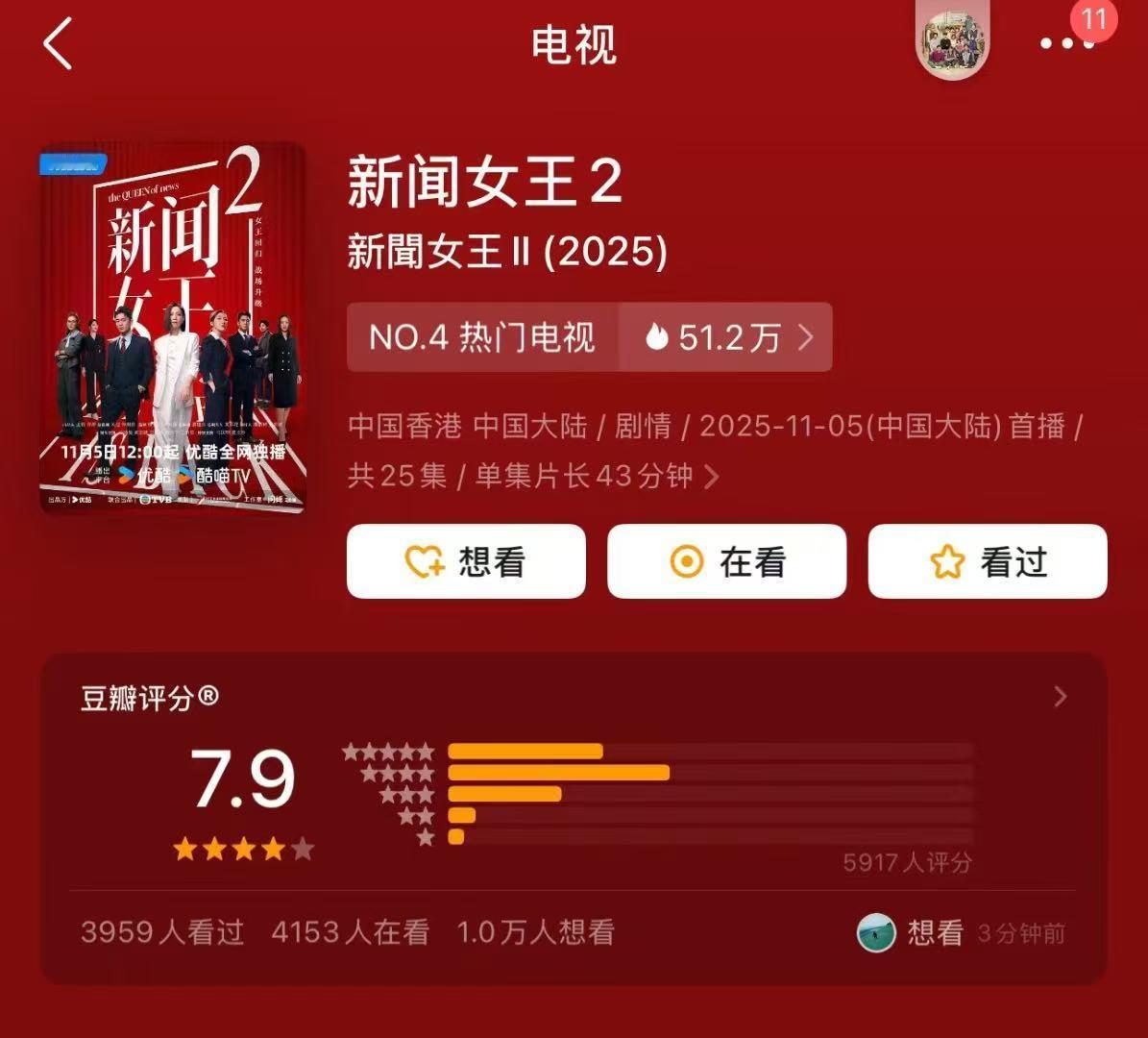新闻女王2豆瓣开分7.9 《新闻女王2》豆瓣开分7.9,巧了,第一季目前豆瓣评分也是7.9[酷]