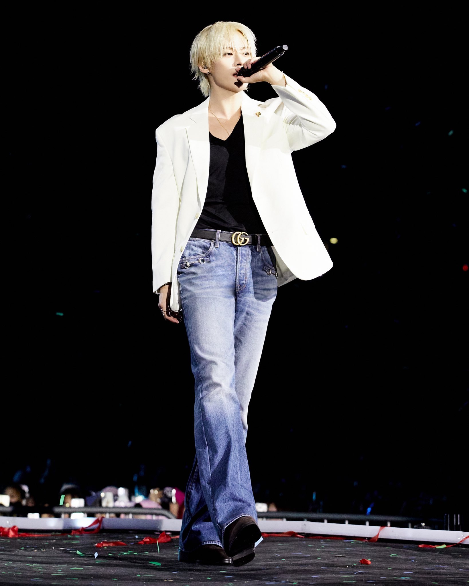 在组合世界巡回演唱会 “Stray Kids World Tour ”上,Gucci Global Ambassador Lee Know上身来自品牌为他特别定制的舞台演出服!剪裁利落的白色西装外套搭配牛仔裤,双G腰带点缀其间。