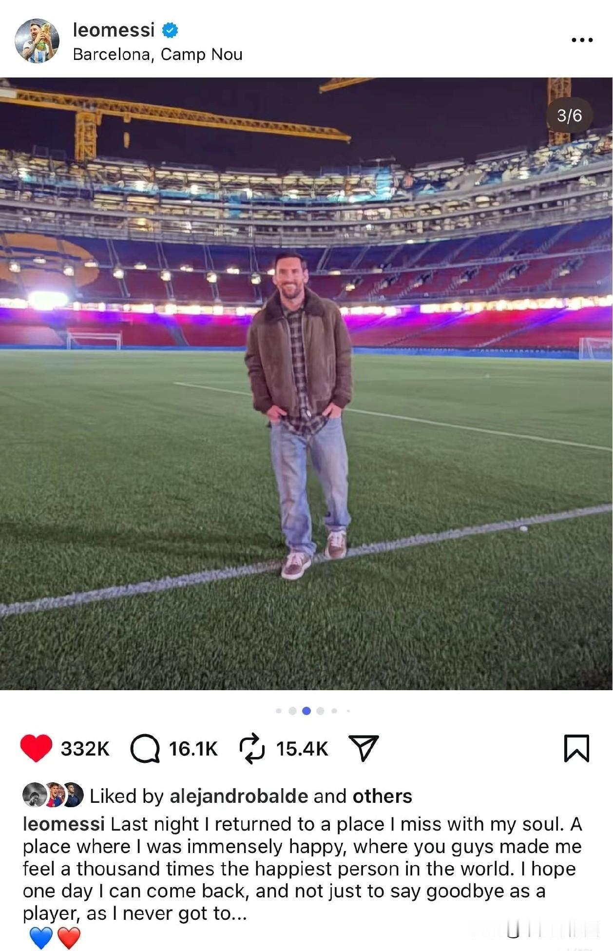 重回诺坎普,梅西发布动态,站在诺坎普球场,面带止不住的微笑。 诺坎普已经翻新两年之久,现在已经完成一半多,开放了两万多个席位,巴萨也回到主场作战。 梅西在完成迈阿密比赛后,也飞往了西班牙,参观了新的诺坎普。 诺坎普——梅西灵魂深处无比怀念的地方。 梅西内心是想再回到这里踢球的,球迷也是非常希望梅西再次回归。 希望这一天能够尽快的到来,诺坎普还欠球王一个华丽的谢幕。 梅西 阿根廷球星梅西