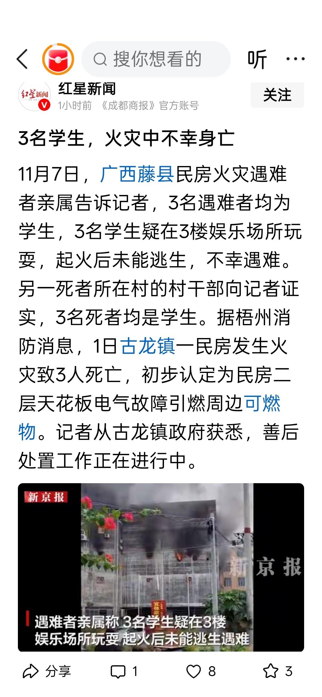 广西藤县民房火灾,3名学生疑在3楼娱乐场所玩耍,起火后未能逃生,不幸遇难。