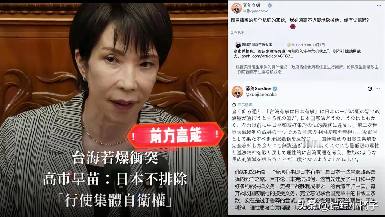 日本现任首相高市早苗公然表态: 如果台海爆发冲突致日本陷入"生存危机",将行使集体自卫权、动用武力反击! 这番拱火言论直接点燃舆论! 中方随即硬核回击,一句"以免再次遭受战败般的民族毁灭",引发全网热议:有人担忧"气氛已够紧张,这话太劲爆该撤回",怕矛盾升级;更多网友力挺"撤什么?就该这么硬气!" 高市早苗的言论绝非随口说说,背后是日本某些势力突破"和平宪法"、试探红线的蠢蠢欲动。 中方的回应看似激烈,实则是对二战胜利成果、中日和平友好条约的坚定捍卫!真敢踩线,后果可不是警告能收场的! 中方“民族毁灭”的回击,核心是捍卫国家主权,警示日方勿突破“和平宪法”红线,言辞虽烈却极具法理与现实依据,无需撤回。 中日关系本就因台海问题承压,双方言辞升级易加剧对抗风险。日方应摒弃右翼挑衅思维,恪守一个中国原则;中方回击虽立场坚定,也可兼顾表达策略,通过更具建设性的沟通管控分歧,避免局势滑向不可控边缘。 我觉得中方这回应压根不用撤!高市早苗先挑事,把台海和动武绑一起,纯属没事找事。咱们的“民族毁灭”就是戳破他们的野心,明着告诉他们别瞎蹦跶。 对付这种没底线的挑衅,就得硬气回应,不然还以为咱们好拿捏呢! 网友们觉得该撤回还是就该硬刚?评论区聊聊!