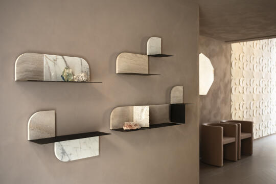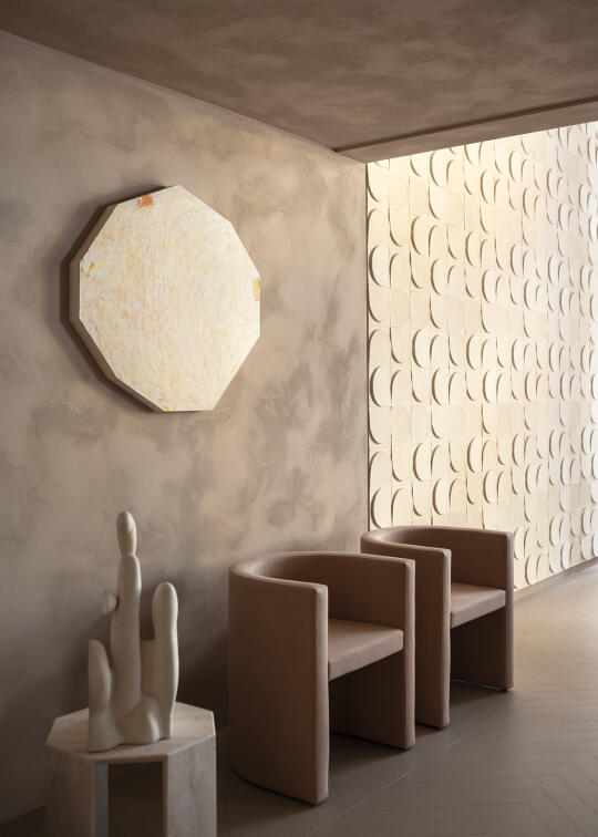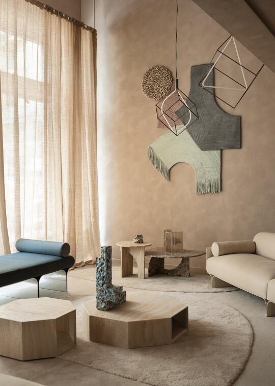 空间中最具代表性的是 Studiopepe 自主研发的 3D 再生纤维素砖,环保可持续、质感特殊,呼应品牌家具对工艺与质地的追求。