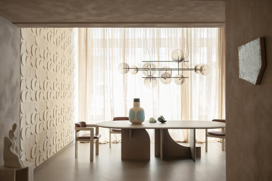 展厅使用羊毛帘幕、木饰面墙体与天然材料,光线通过帘幕层层过滤,室内氛围柔和而沉静。展厅中还陈设了一幅手工丝绸挂毯,在无隔断的布局中创造出流动感。