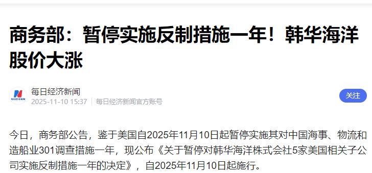 这下李在明终于可以放心了,中国正式官宣!11月10日商务部决定,暂停对韩国造船巨头韩华海洋在美子公司的反制,然而咱们并没有完全放开,还给韩国公司一个条件:暂停一年,换句话说,如果韩华有什么不好的操作,咱们也会一点面子都不给,立马进行反制! 其实这段时间韩国政坛对造船业的关注度特别高,韩华海洋作为韩国造船巨头,手上握着不少订单和就业岗位,之前咱启动反制时,韩国国内就掀起不小的风波。 一旦反制生效,韩华海洋那点家底可经不起折腾,这家占了韩国造船业28%市场份额的巨头,2024年营收刚到53亿美元,反制消息一出股价单日就跌了5.8%,市值直接蒸发8亿元。 更要命的是它美国子公司的命门——70%的船用钢板都得从中国进口,这比从日本买便宜10%到20%,断供后单船成本立马涨120万美元,直接啃掉7%的订单利润,费城造船厂承接的美国海军订单本来想扩产到年产20艘,结果钢板一断供只能停工,交付推迟到2029年,光这一项就亏了3亿多美元。 还有韩国本土2.3万名员工和美国子公司1200个岗位都悬了,业内预计到2026年得少8000个工作岗位,这对要保民生的李在明来说,简直是踩在刀尖上走路。 韩国想找替代品?东南亚钢厂产能才是中国的10%,交货周期还多4个多月,供应链根本扛不住,要知道韩华海洋在全球VLCC市场占着19.5%的份额,今年光这类订单就接了10艘,一旦供应链掉链子,这些订单要么飞了要么亏惨,韩国造船业的全球地位都得打折扣。 之前韩国政府还计划联合三大船企投9万亿韩元搞技术优势,这下反制一来,别说技术突破,保住现有盘子都难,李在明那段时间急着启动中韩经贸沟通渠道,态度软得跟之前判若两人,说白了就是被打疼了,知道真闹大了承受不起。 不过,咱也不是不讲理,11月10日商务部官宣暂停反制,根源是美国先松了口——前一天刚宣布暂停对中国造船业的301调查一年,咱第二天就跟进了,这操作明眼人都懂,不是给韩国面子,是看在中美经贸缓和的份上。 但放松不等于放任,商务部特意强调“暂停一年”,这话里的门道可深了,要知道韩华之前干的事实在不地道,为了讨好美国,不仅提交中国船厂的钢板来源、焊接成分这些敏感数据,还建议搞歧视性收费,纯属自己往枪口上撞。 现在给它一年观察期,相当于把缰绳攥得更紧了,这期间要是再敢配合美国搞小动作,或者在供应链上耍花样,反制措施分分钟重启,毕竟中国手里的牌硬得很,4月新船订单量以57.8%的市场份额重回全球第一,手持订单3095万载重吨,是韩国的四倍多。 韩华要真丢了中国的钢板供应和潜在合作,就算美国订单给得多,成本和交付周期也能把它拖垮,再说韩国造船业离不开中国的稀土、特种钢这些核心材料,之前制裁刚落地,连F-35生产线都因为稀土短缺停了,这教训够深刻了。 所以,说李在明是能松口气,但绝对不敢彻底放心,韩国现在还是夹在中美之间,一边想靠美国的军工订单赚快钱,一边又怕得罪中国丢了供应链根基,这种“双线策略”根本玩不长久,这次暂停反制其实是给韩国指了条明路:别想着两头讨好,踏踏实实遵守规则才是正经事。 说到底,在全球造船业格局里,中国早就不是只能被动应对的角色了,从订单量反超到供应链主导,手里的筹码越来越多,韩华要是真把暂停当“免罪符”,那下次可就不是市值蒸发几亿这么简单了。