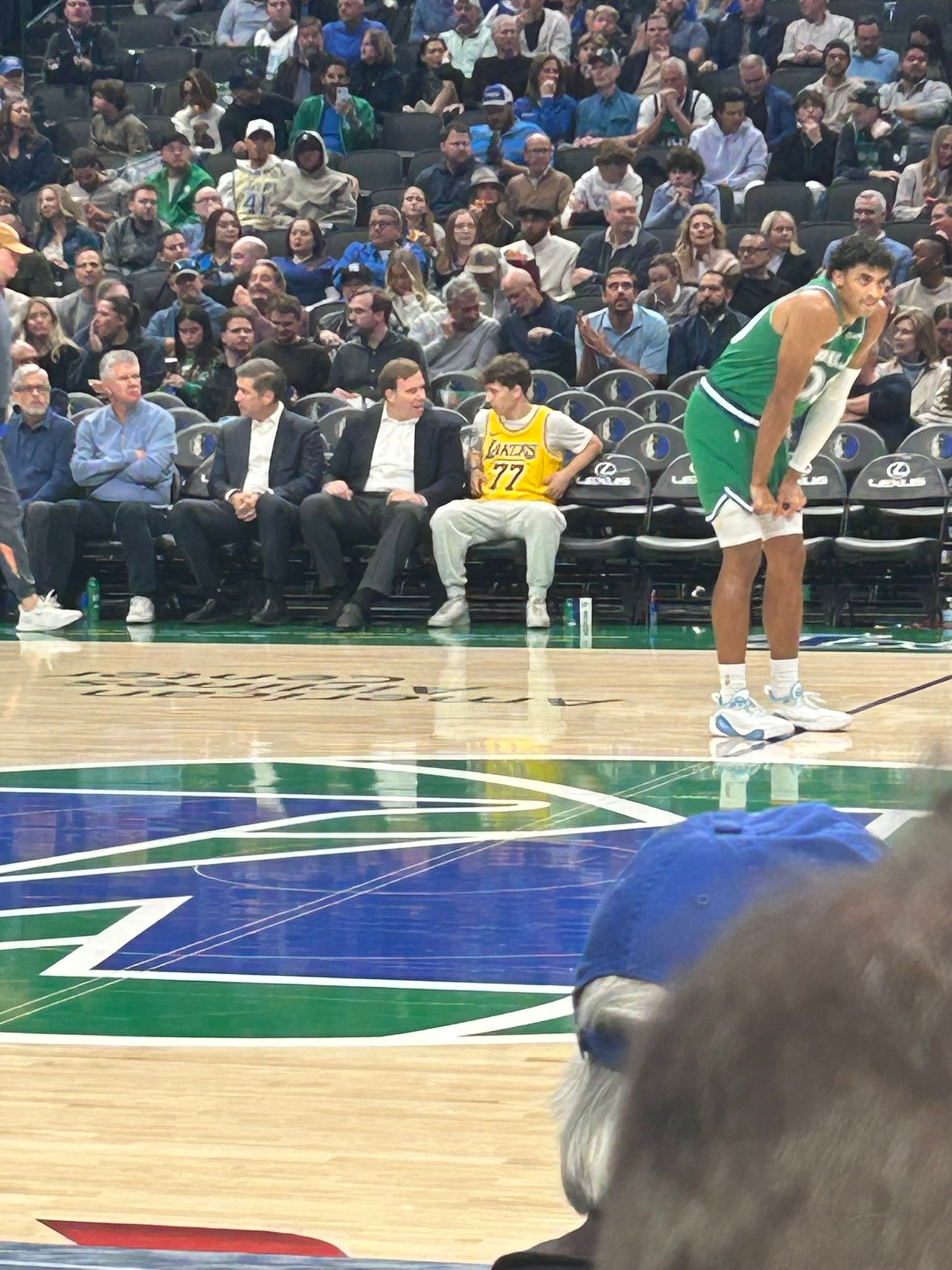 史诗级同框,独行侠老板杜蒙特和一位穿着东契奇湖人球衣的球迷谈心