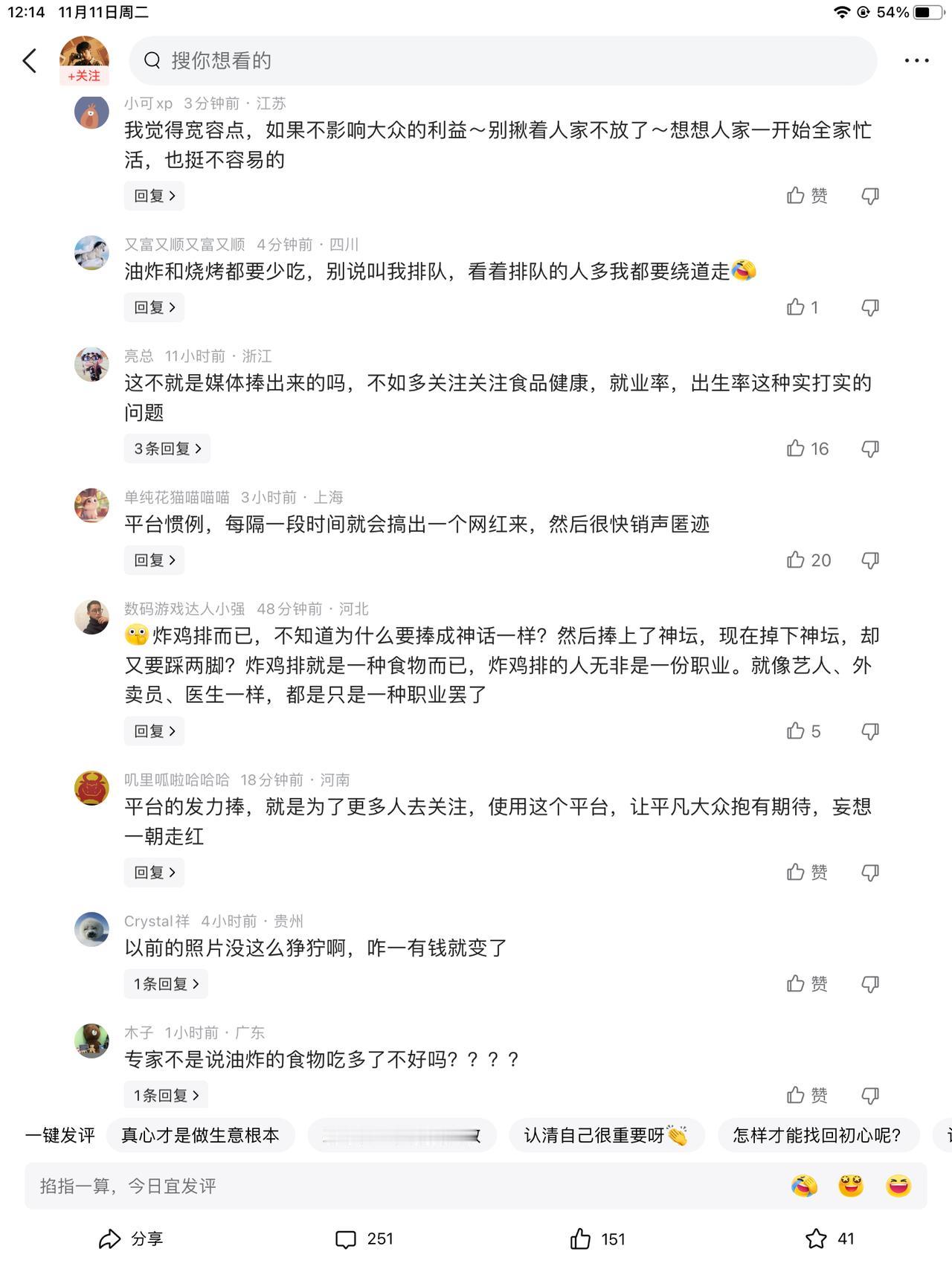 鸡排哥,从大众追捧到面目狰狞,用了一个月的时间。从给小朋友的鸡排少一块钱,到全国巡炸,到四处指点江山。网友彻底不买账了。 排队买鸡排的时候,带动了家乡的旅游。有好处也有坏处。比如周边的小吃,都只有看热闹的份儿。听说鸡排哥于心不忍,才开始了全国巡炸的新征程。 试想一下,他不是一夜吸粉无数,不是一夜暴富。就还是安安稳稳的炸鸡排,讲土味情话,大家还会喜欢他多久?