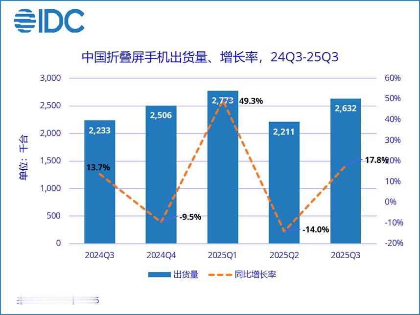 2025 年第三季度,中国折叠屏手机出货量达到 263 万台,同比增长 17.8%。