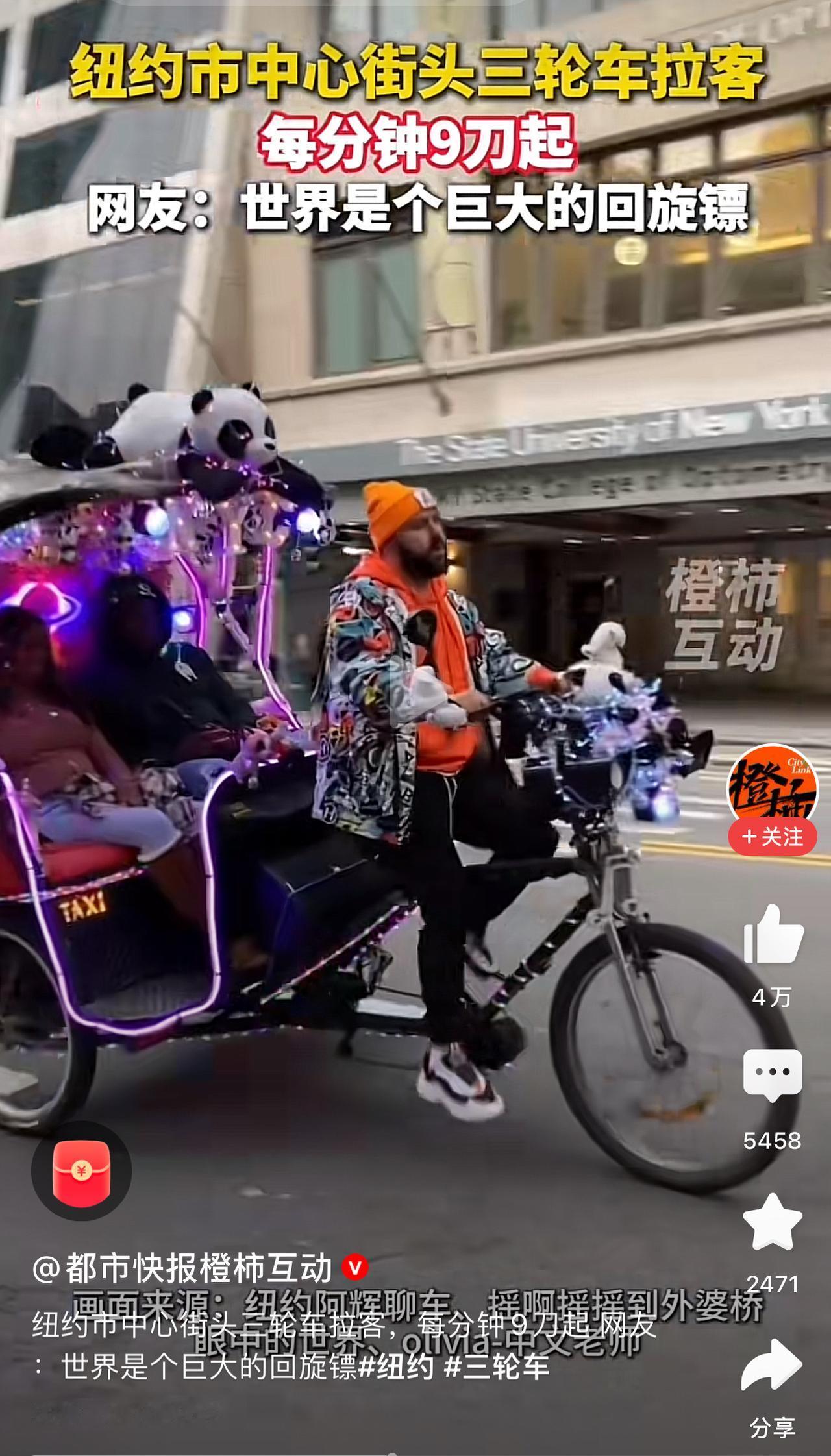 真没想到啊,我们淘汰的人力三轮车载客竟然在美丽国上市了。30年风水轮流转! 纽约曼哈顿中心街区(中央公园、时代广场一带)的人力三轮车(Pedicab)按时间计费,起步价普遍为每分钟 9 美元,10 分钟短途下来通常接近 100 美元。车夫多穿醒目制服,兼做导游,收入高低取决于客流、天气和工作时长,旺季个别车夫单日毛收入曾冲到 1000 美元,但这并非日常常态,还需扣除车辆租金、保险等成本。