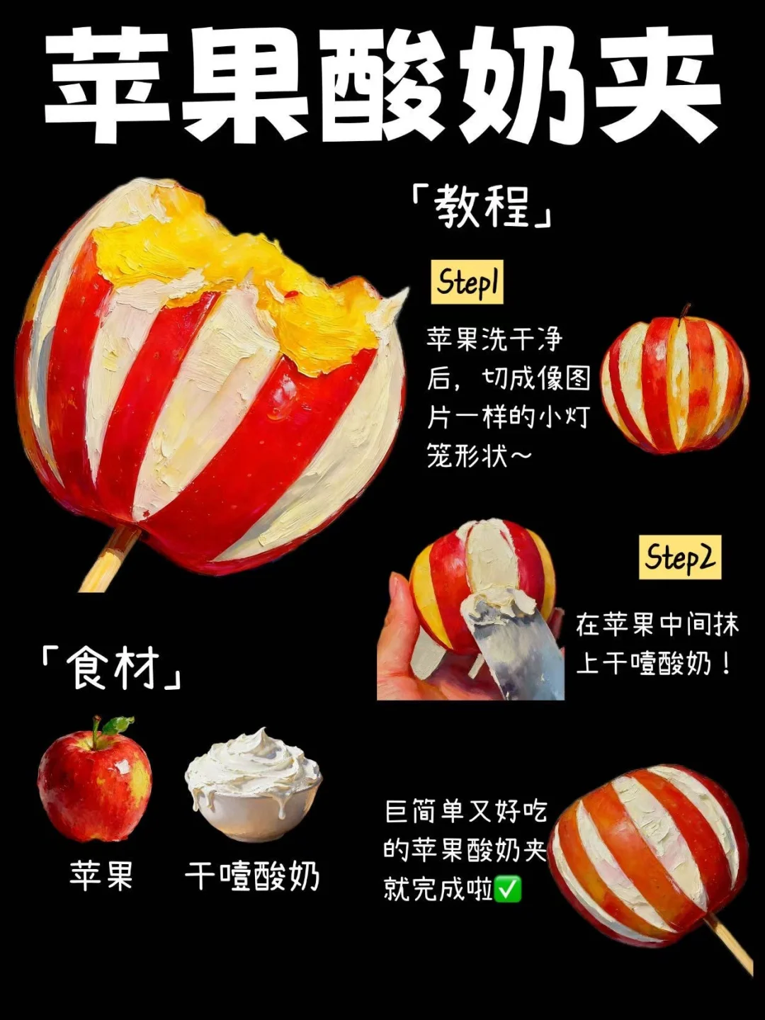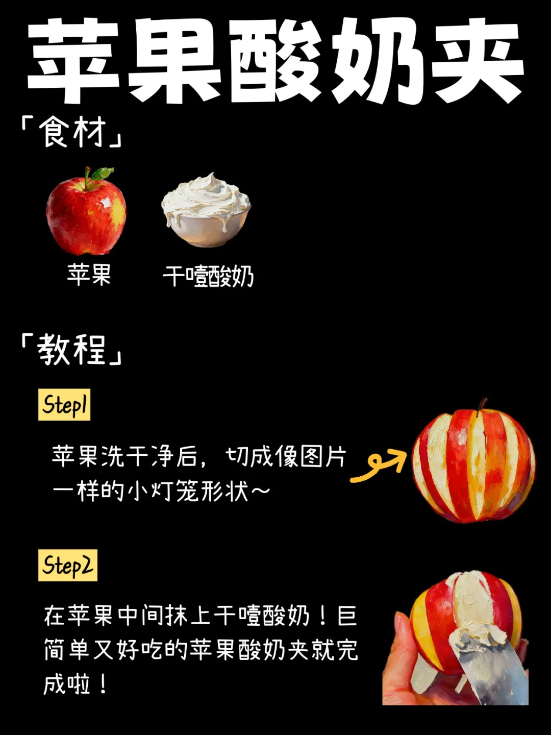 🔥一学就会的苹果酸奶夹!巨好吃!一口下去又脆又甜巨好吃~献上超详细教程给你们~吃不完的苹果就这样做!! 💗食材只需要苹果和干噎酸奶!! 『教程』 1️⃣苹果洗干净后,切成像图片一样的小灯笼形状~ 2️⃣在苹果中间抹上干噎酸奶!巨简单又好吃的苹果酸奶夹就完成啦✅ 🍎口感很奇妙丰富,脆脆甜甜的巨好吃!!