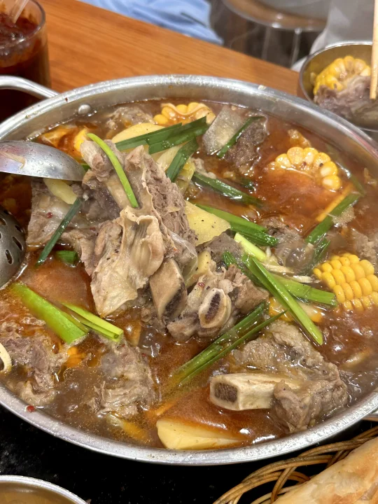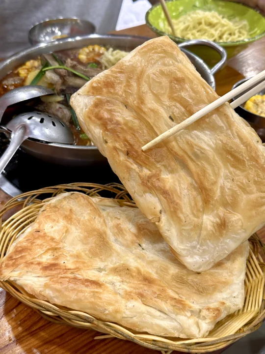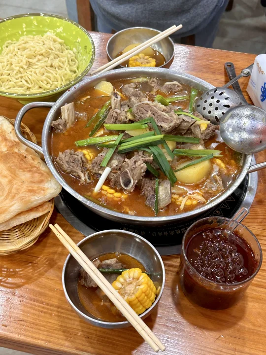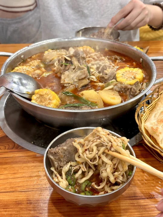 太!好!吃!了!!! 这么大一锅牛排才128!!份量足够三个人吃,牛肉很香连筋带骨的!里面配菜有土豆玉米越煮越好吃!!尤其是老板自己做的两种辣椒好喜欢!我们还煮了一份面进去真的撑得不行又停不下来😭酥油饼2r也好大一张!!!