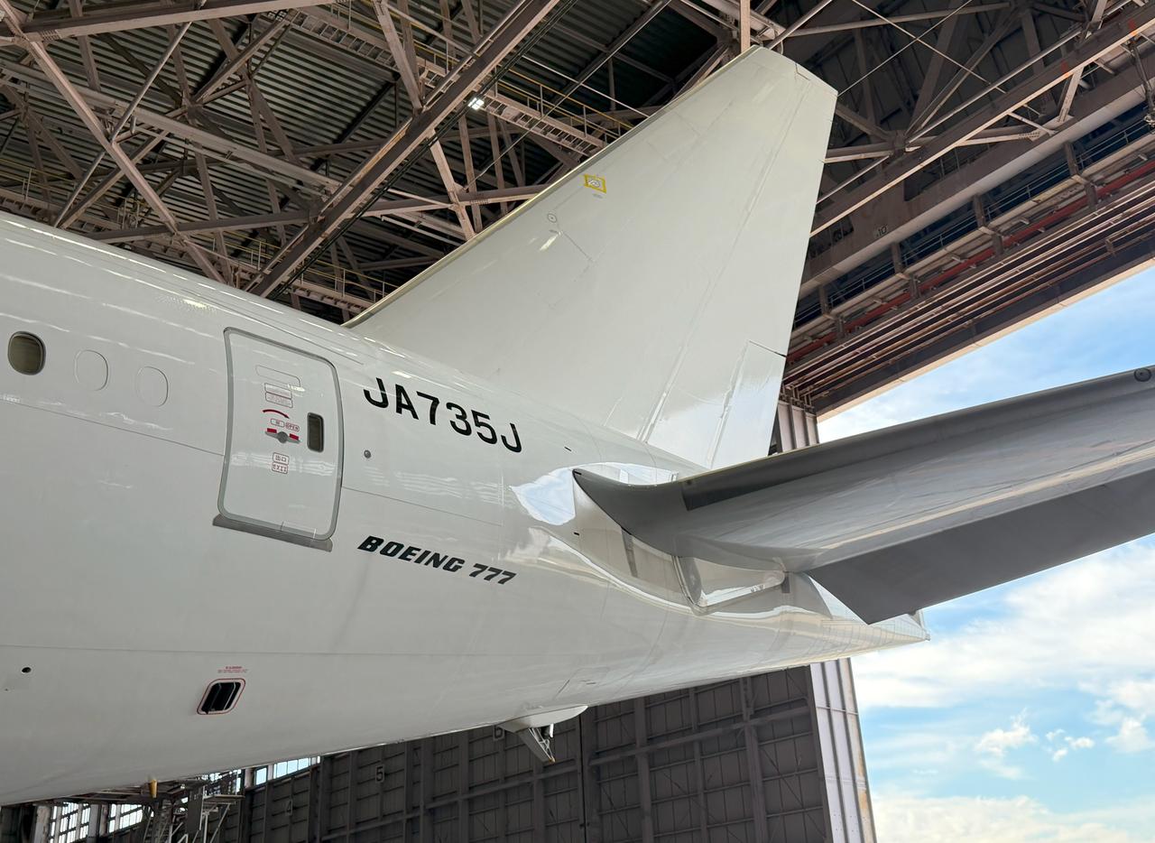 从日航退役的波音777-300ER,交付给新用户前的最终维护。 机身标志被重新涂