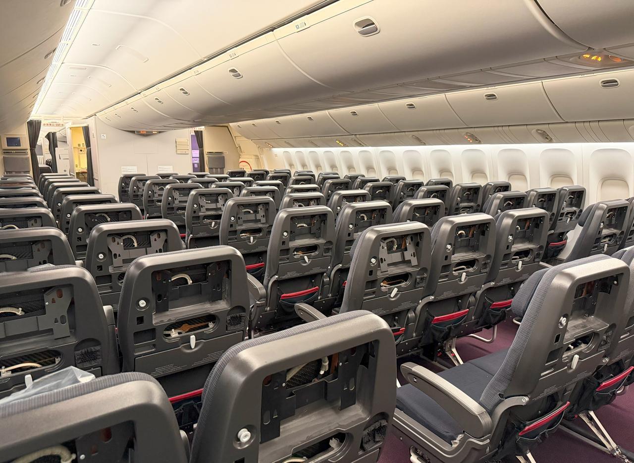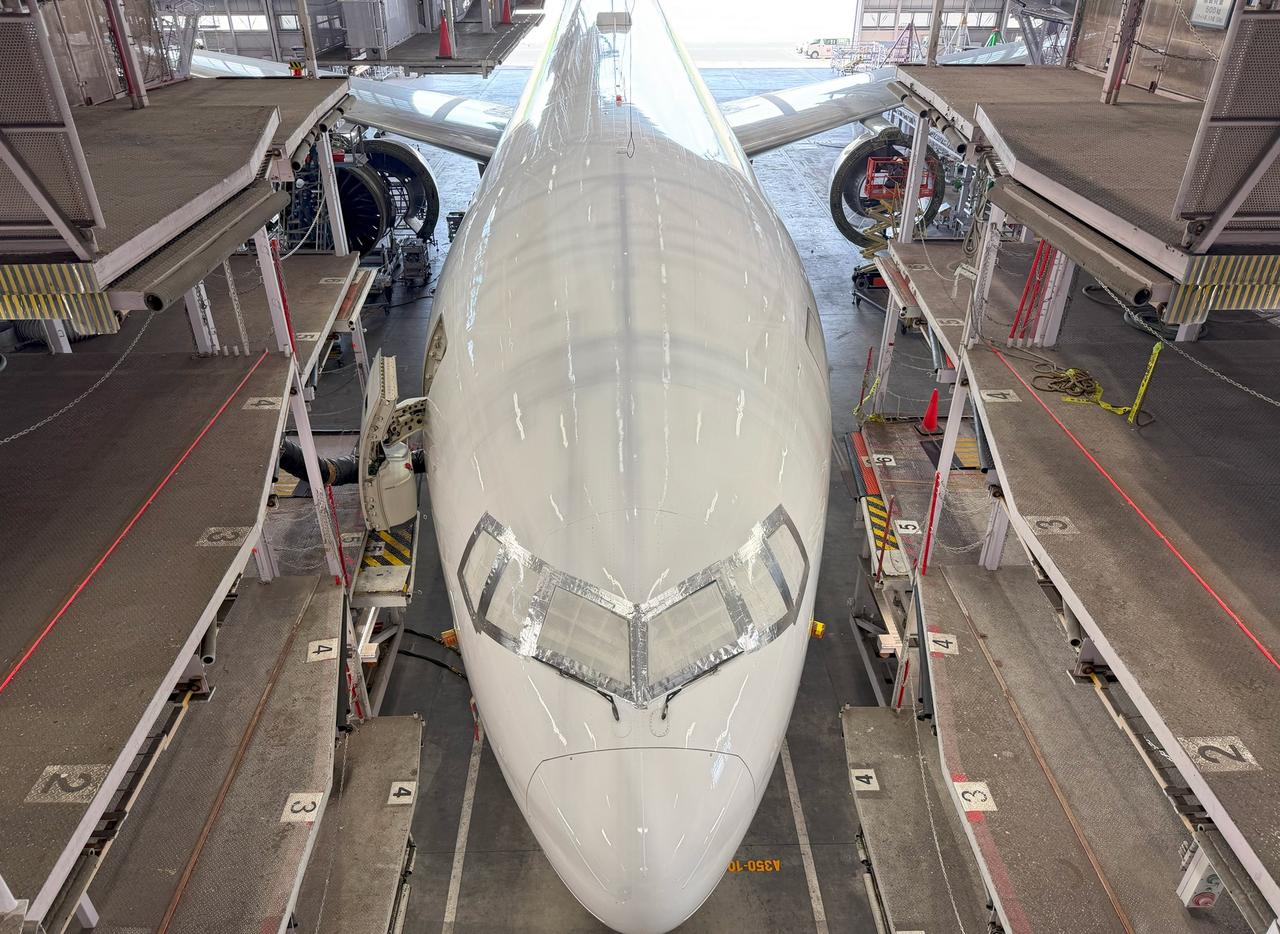 从日航退役的波音777-300ER,交付给新用户前的最终维护。 机身标志被重新涂成纯白色,日航特有的部件(如机上显示器)被拆除,整架飞机都经过了彻底检查