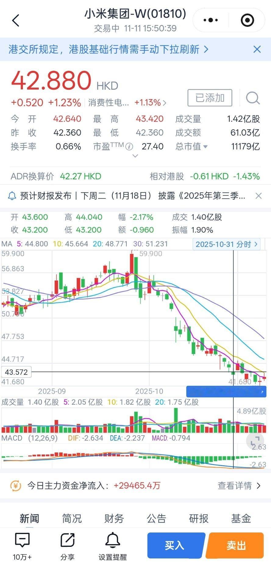 我综合判断了一下,10 月 31 日还是没入手小米的股票,现在来看判断是正确的,估计这轮下跌还没到头,什么时候破 40 再说吧