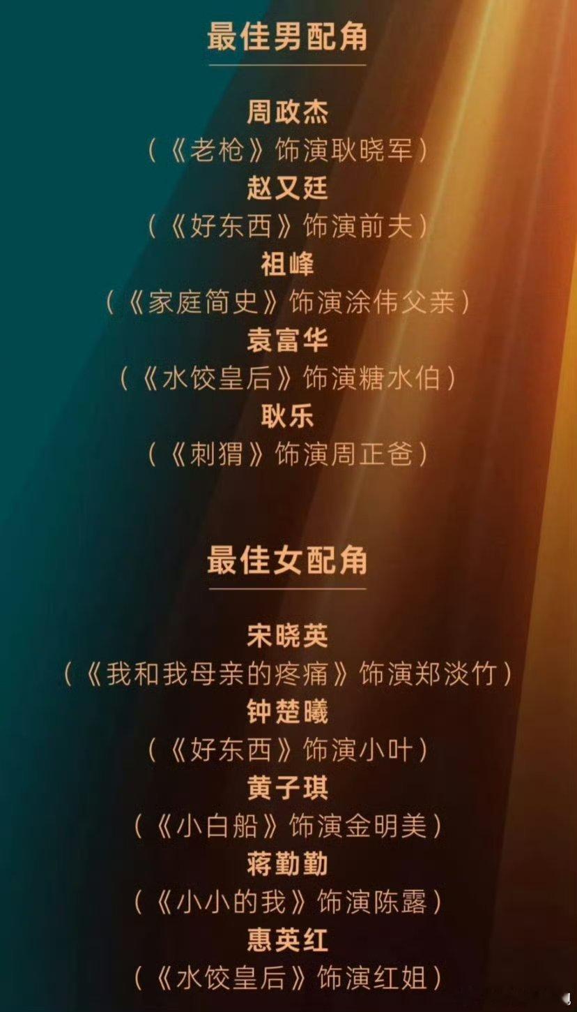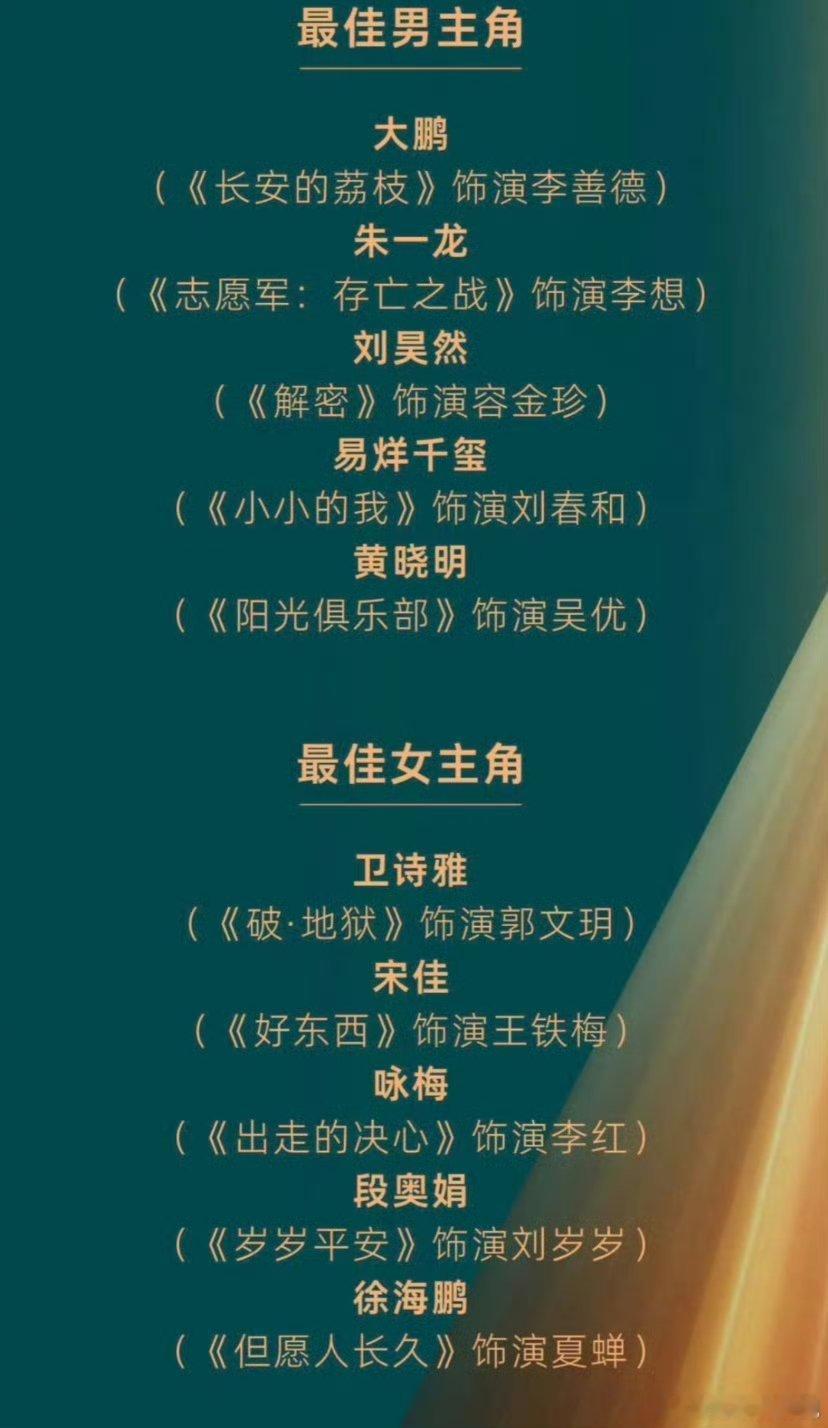 今年的金鸡奖感觉还挺有看点,黄晓明已经二封,朱一龙一封,易烊千玺四提,已经开始期待颁奖了!最佳男主角提名:大鹏(《长安的荔枝》饰演李善德)朱一龙(《志愿军: 存亡之战》饰演李想)刘昊然(《解密》饰演容金珍)易烊干玺(《小小的我》饰演刘春和)黄晓明(《阳光俱乐部》饰演吴优)最佳女主角提名:卫诗雅(《破·地狱》饰演郭文玥)宋佳(《好东西》饰演王铁梅)咏梅(《出走的决心》饰演李红)段奥娟(《岁岁平安》饰演刘岁岁)徐海鹏(《但愿人长久》饰演夏蝉)最佳男配角提名:周政杰(《老枪》饰演耿晓军)赵又廷(《好东西》饰演前夫)祖峰(《家庭简史》饰演涂伟父亲)袁富华(《水饺皇后》饰演糖水伯)耿乐(《刺猬》饰演周正爸)最佳女配角提名:宋晓英(《我和我母亲的疼痛》饰演郑淡竹)钟楚曦(《好东西》饰演小叶)黄子琪(《小白船》饰演金明美)蒋勤勤(《小小的我》饰演陈露)惠英红(《水饺皇后》饰演红姐)