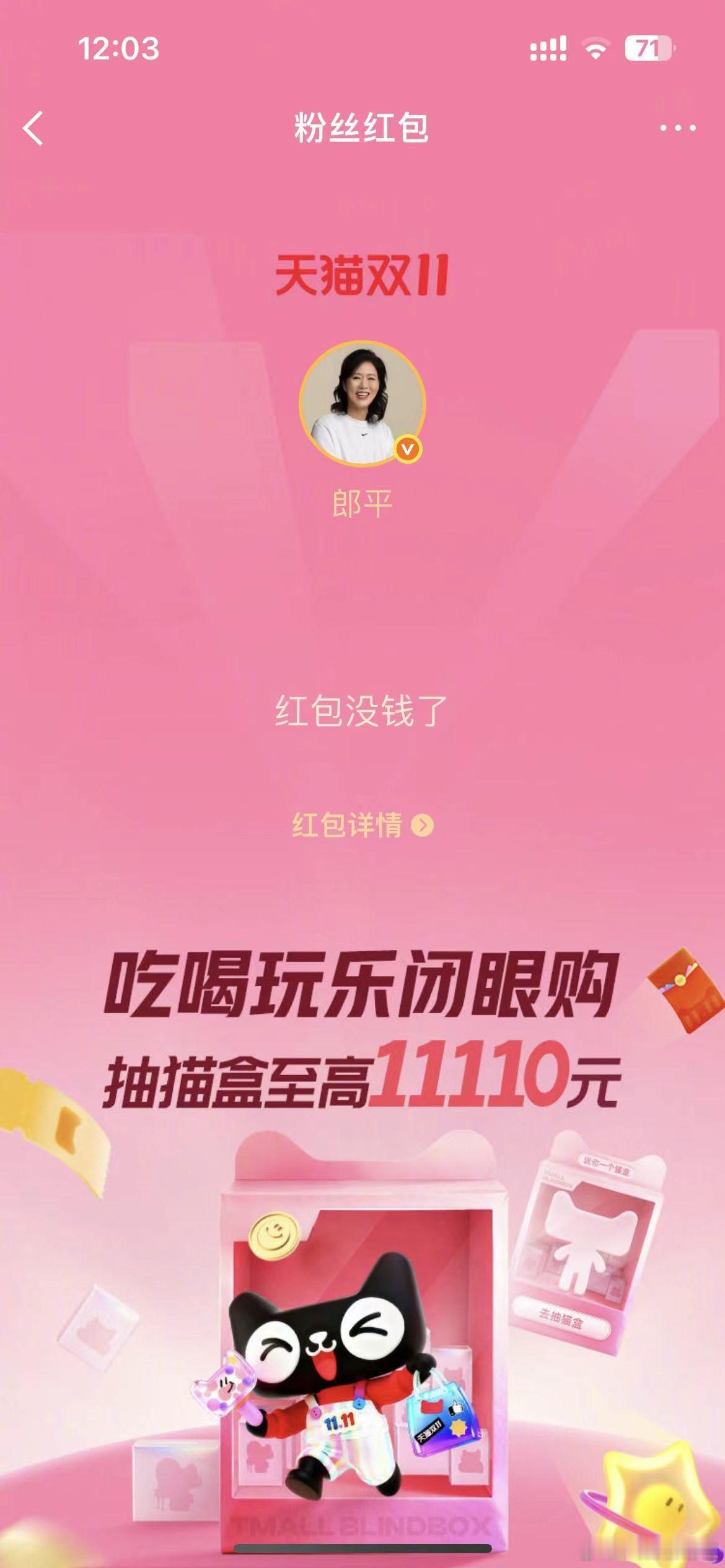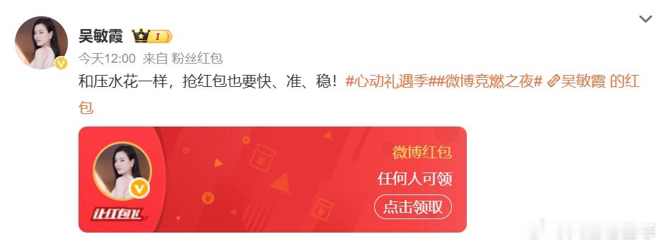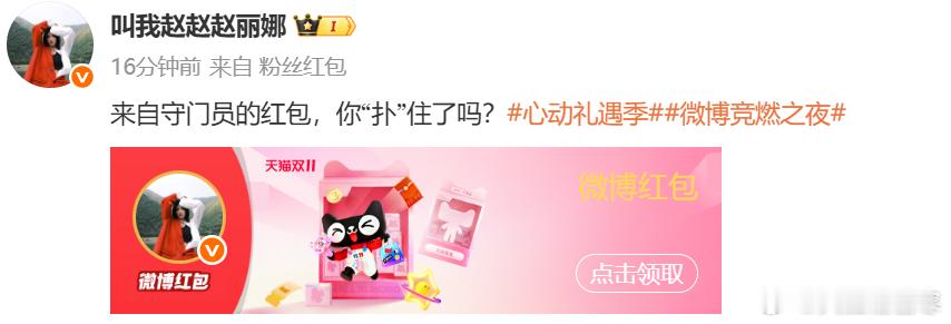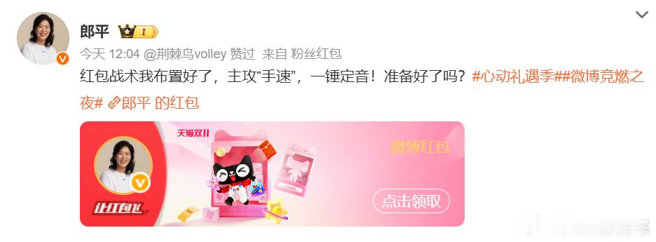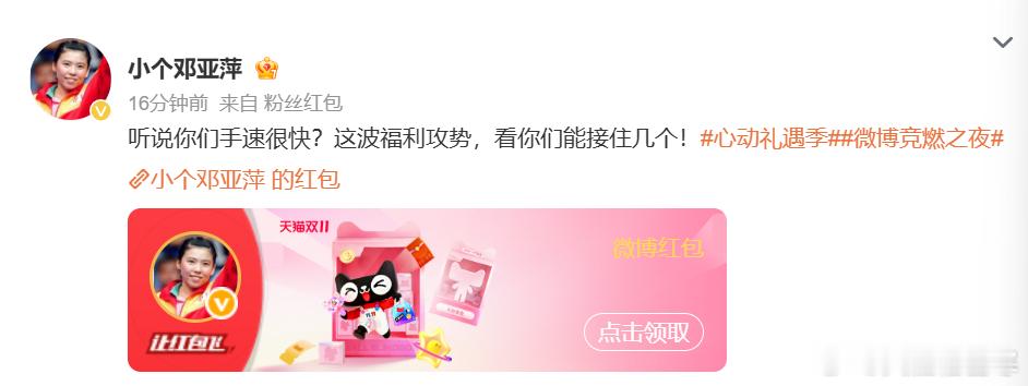 宝子们,双11心动礼遇季福利全面升级啦!冠军红包天团已经霸气集结!郎平扣杀发红包、赵丽娜扑球撒福利、吴敏霞跳水式送钱、邓亚萍乒乓暴击送礼,这阵容简直太炸裂!让你感受体育明星带来的超强震撼!不过,更让人期待的还在后头!11月11日,神秘顶流将空降微博狂撒红包!TA会是谁呢?是体坛的另一位传奇,还是跨界的超级巨星?这悬念简直让人按捺不住好奇心!现在就赶紧参与抽红包、集猫盒活动,说不定丰厚大奖就砸到你头上!这么难得的机会,千万不要错过!一起在这个双11,与明星们来一场惊喜邂逅,把福利拿到手软!