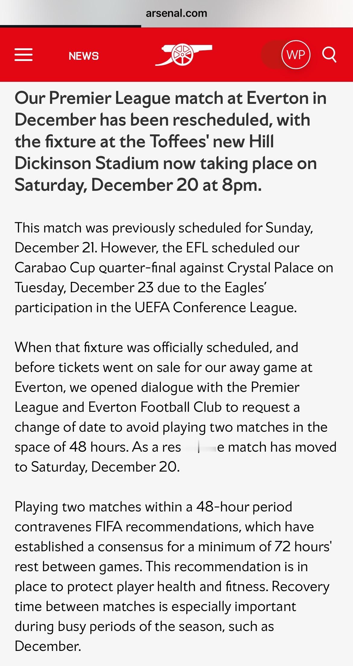 阿森纳官方宣布:我们12月客场对阵埃弗顿的英超联赛比赛已重新安排,这场在太妃糖新主场希尔·迪金森球场进行的比赛现将于12月20日星期六晚上8点(英国时间时间)开球。此场比赛原定于12月21日星期日进行。然而,由于水晶宫参加欧足联欧洲协会联赛,英格兰足球联赛将我们与水晶宫的卡拉宝杯四分之一决赛定于12月23日星期二举行。在该赛程正式确定后,且在我们客场对阵埃弗顿的比赛门票开始销售之前,我们与英超联赛和埃弗顿足球俱乐部进行了对话,请求更改比赛日期,以避免在48小时内进行两场比赛。因此,比赛被调整至12月20日星期六。在48小时的时间内进行两场比赛违反了国际足联的建议,该建议已确立比赛间至少休息72小时的共识。此项建议旨在保护球员的健康和体能。在赛季繁忙时期(例如12月),比赛间的恢复时间尤为重要。