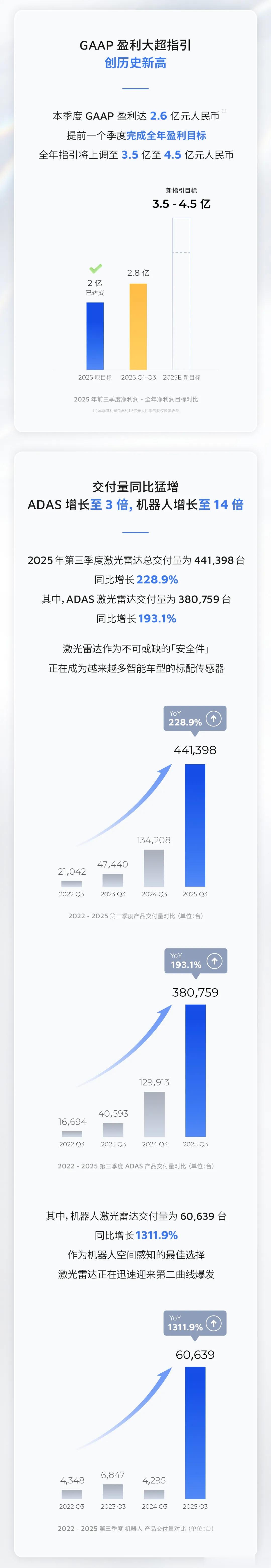 禾赛科技发布 2025年第三季度财报- 营收 8.0 亿元人民币,同比增长 47.5%;- 净利润达到 2.6 亿元人民币,提前一个季度完成全年盈利目标;全年指标上调至 3.5 亿元- 4.5 亿元人民币;- 激光雷达总交付量为 441398 台,同比增长 228.9%;其中 ADAS 产品交付量为 380,759 台,同比增长 193.1%,机器人领域产品交付量为 60,639 台,同比增长 1311.9%;本季度,斩获前两大 ADAS 客户 2026 年全系车型定点合作,并实现激光雷达 100% 标配。同时,斩获首个“主雷达+多颗补盲雷达”乘用车量产定点,计划于 2026 年底或 2027 年初启动量产。