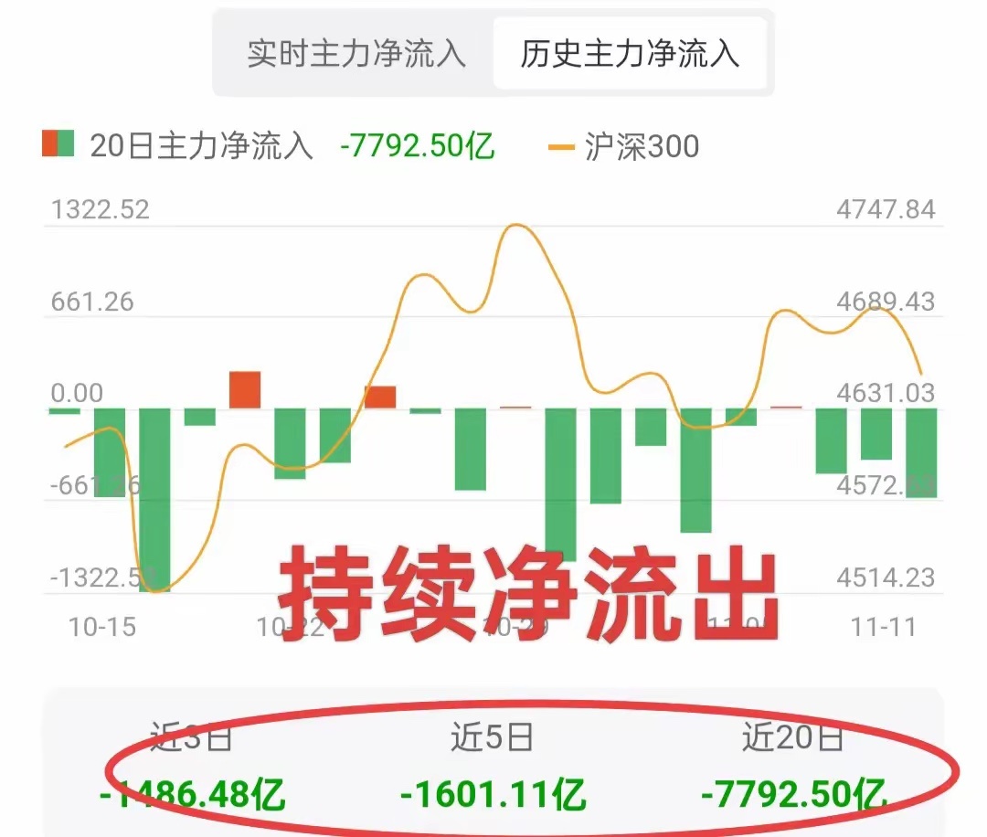 A股:主力比散户聪明多了!最近20个交易日,主力资金净流出接近8000亿!从大盘运行趋势看,进入到10月份以来,以至11月上旬,大盘基本上是个横向整理的格局,也可以理解为高位横盘。如果把大盘看作是一只股票,那么就可以理解主力资金在这段时间的净流出了。因为那些个牛股,一旦进入到高位震荡时期,事后回过来看,高位震荡区域即便不是历史大顶,至少也是阶段性顶部。渔夫讲过,非游资制造的牛股,资金出货方式通常不是瀑布下杀,而是在高位反复拉锯,目的是不断吸引散户接盘。目前主力还护着大盘,不是它们有多么善良,而是在局部区域疯狂出货。当然,从目前市场整体来看,资金不会退出市场,而是从一个局部流出,又可能流入另一个局部。很多人经常说的一句话,牛市坚定持股!这句话对,这句话也不对。牛市不空仓是对的,但不是一直持有某些股票,而是要跟随市场的变化调整持仓结构,该走的要走,该进的要进。否则,很有可能跑输市场。8月底,大盘收盘是3857点,今天大盘收盘4002点,涨了145点。在2个多月的时间里,虽然大盘涨幅不大,也有超过3%的涨幅。但有不少投资者已经输给市场了,甚至把之前赚到的钱又还给市场了。牛市,往往会制造最大的坑。曾经疯狂的白酒就是前车之鉴……个人观点,仅供交流,不构成投资建议!理财有风险,投资需谨慎!