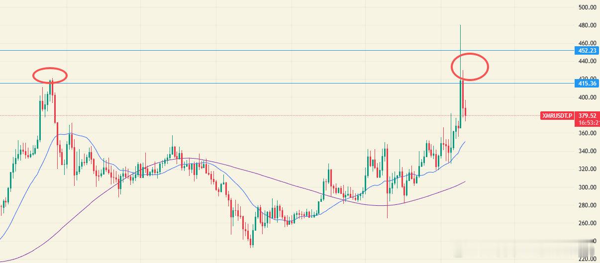 XMR前天说过市值过大,而且走到前高附近形成双顶,目前已经震荡回调,继续逢高控就可以了。