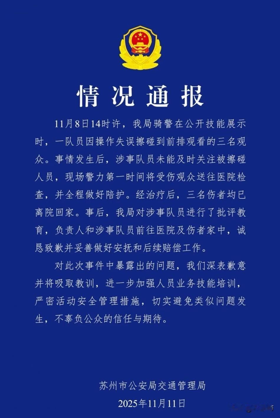 苏州交警道歉,说在8日下午有一名铁骑在展示技能时,因操作失误导致有3名观众被撞伤,而且没有在第一时间关注被撞人员,现在已经对涉事队员进行批评教育。