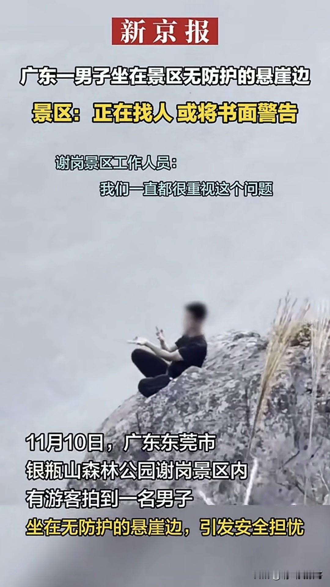 我觉得景区完全没用必要找这个人,不然张家界风景区起码要投资10个亿安装栏杆。一个成年人自己喜欢嘚瑟一下,难不成你每个危险点都安排一个安保人员守着?至于书面警告更没必要,他又不是小孩子,自己心里很清楚这样做的风险,正所谓“阎王也拦不住找死的鬼”,这种情况每年都要上演很多次,有的被海浪卷走的,有的自己跌落悬崖的,有的还被动物园猛兽咬死的,说实话根本干预不过来。所以只需要在这种位置树立一个警示牌就足够了,你们觉得呢?