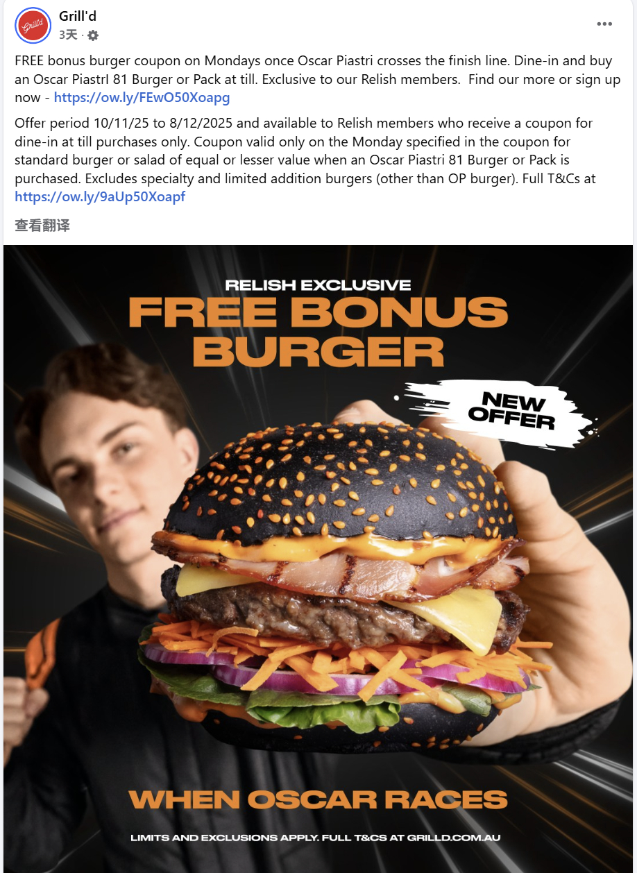 今年初,皮亚斯特里代言了澳大利亚汉堡连锁品牌Grill'd。该品牌原本设定了一个促销活动:2025年9月8日-12月9日,只要皮亚斯特里在F1大奖赛中登台,顾客于赛后周一购买奥斯卡·皮亚斯特里限定汉堡,即可获得买一赠一的福利。但是皮亚斯特里自从9月7日在F1意大利大奖赛中登台之后,至今再也没有登上过领奖台。于是Grill'd现在把促销活动的条件改成了只要皮亚斯特里冲线完赛,顾客就可以获得买一赠一