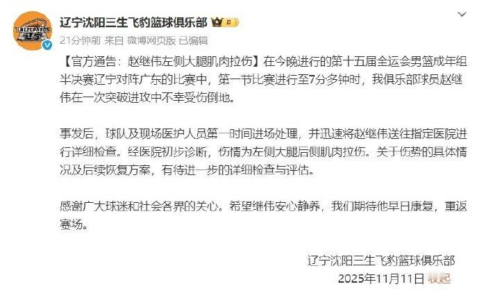 官方通告:“经医院初步诊断, 伤情为左侧大腿后侧肌肉拉伤。关于伤势的具体情况及后续恢复方案,有待进一步的详细检查与评估。 ”