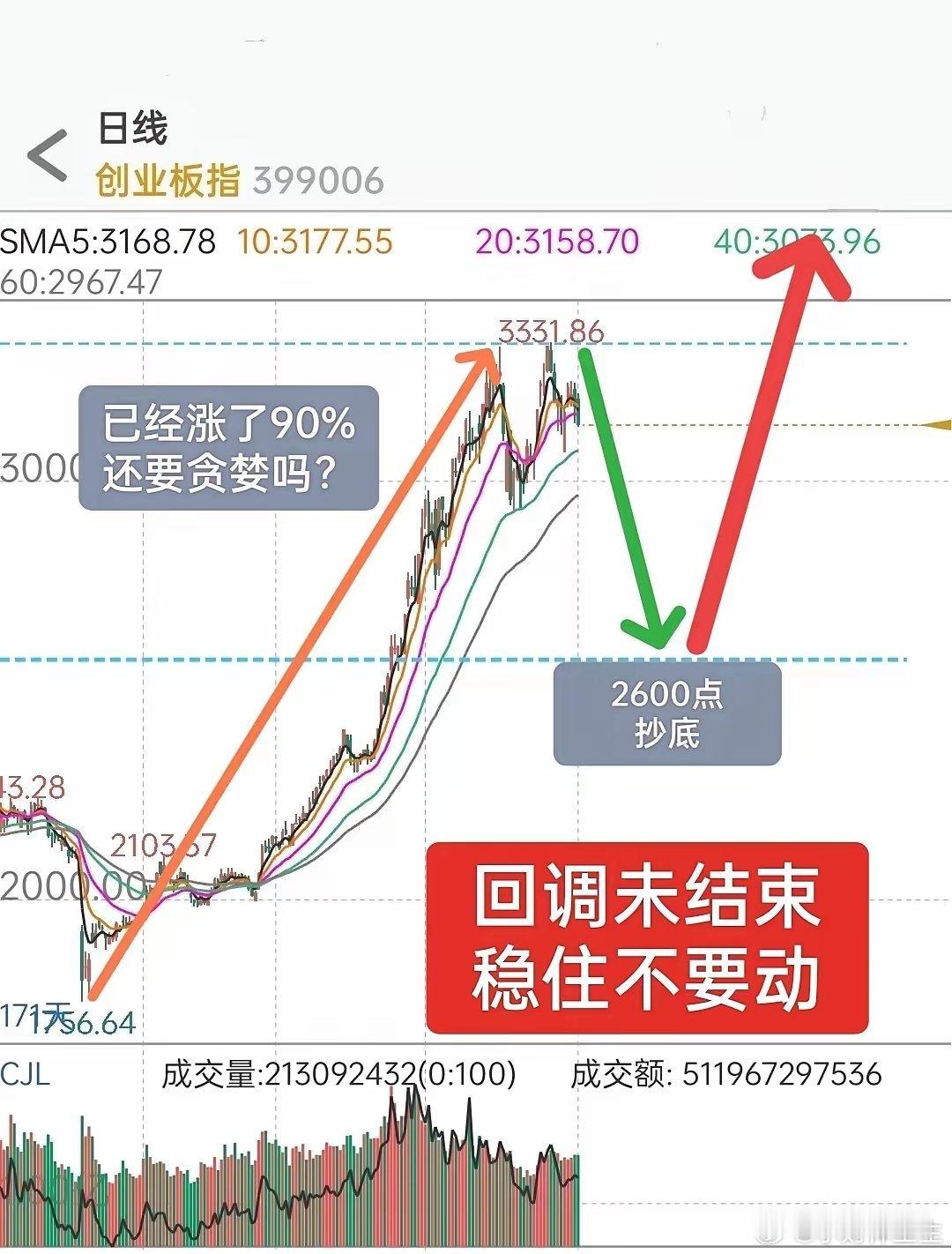 A股全线下跌,可以买了吗?回调未结束,稳住不要动!创业板指数回调到2600点,是我们抄底的时机盘后说几点1,A股今日全线下跌,回调结束了吗,可以买了吗。我认为A股回调未结束,预判创业板指数至少回调2600点,届时回调才结束,同时2600点才是我们入场的时机。2,股市投资需要远见,不能只盯着今天或者明天的涨跌。要研究大趋势,跟随大趋势,然后放长线钓大鱼。虽然A股当下的大趋势是上涨趋势,但是上涨趋势已经连续上涨了七个月,明显过热了,所以接下来需要回调休整,待回调休整结束后牛市还会持续发展。3,散户不要根据新闻利好信息去交易,因为你干不过专业大户和主力,还有机构。一方面,散户对消息的收集、处理、理解能力不如专业的大户和机构,往往你根据利好消息去买,然而却跌了;另一方面,主力和机构不是根据利好消息去交易,而是根据未来预期、估值和趋势去交易的。
