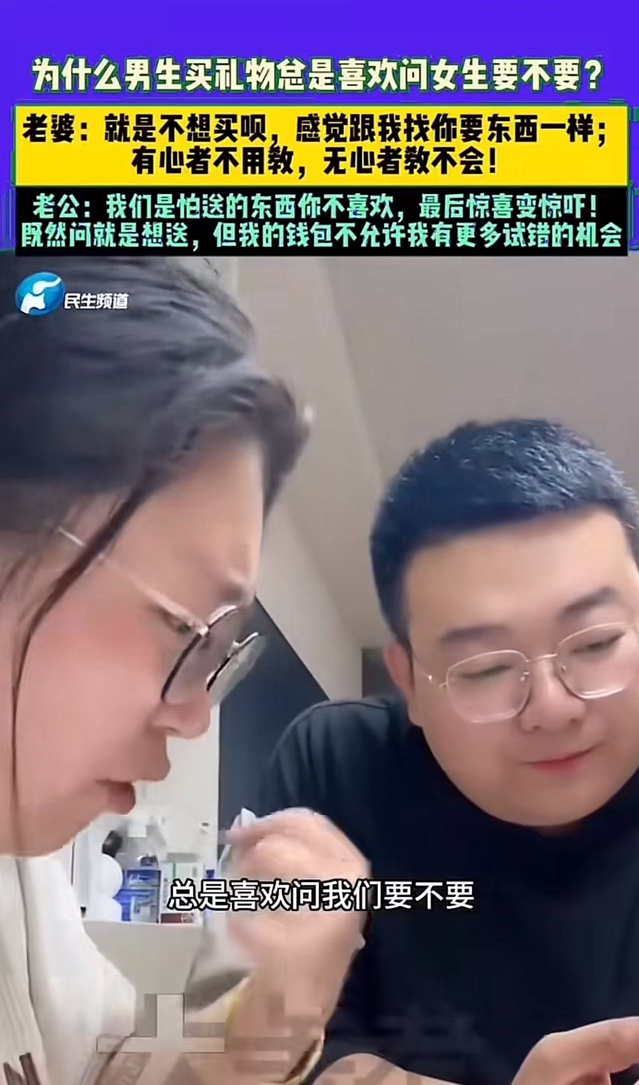 可老婆却生气,觉得老公每次买东西都问要不要,一点惊喜都没有。