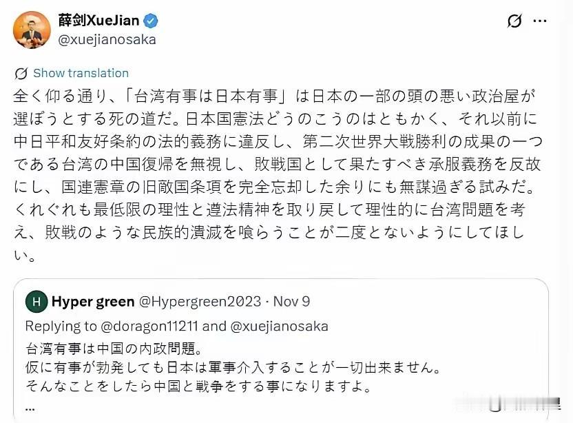 “‘台湾有事就是日本有事’是日本某些愚蠢的政客妄图选择的死亡之路”……“这是违背作为战败国应尽的臣服义务、完全忘却联合国宪章中旧敌国条款的过于鲁莽的尝试”中国台湾问题 日本历史罪责 这是外交官基于中国的军事实力和国际政治经济地位的正常发言,此处应有掌声[鼓掌][鼓掌][鼓掌]台湾事儿 日本军国主义 日本帝国主义
