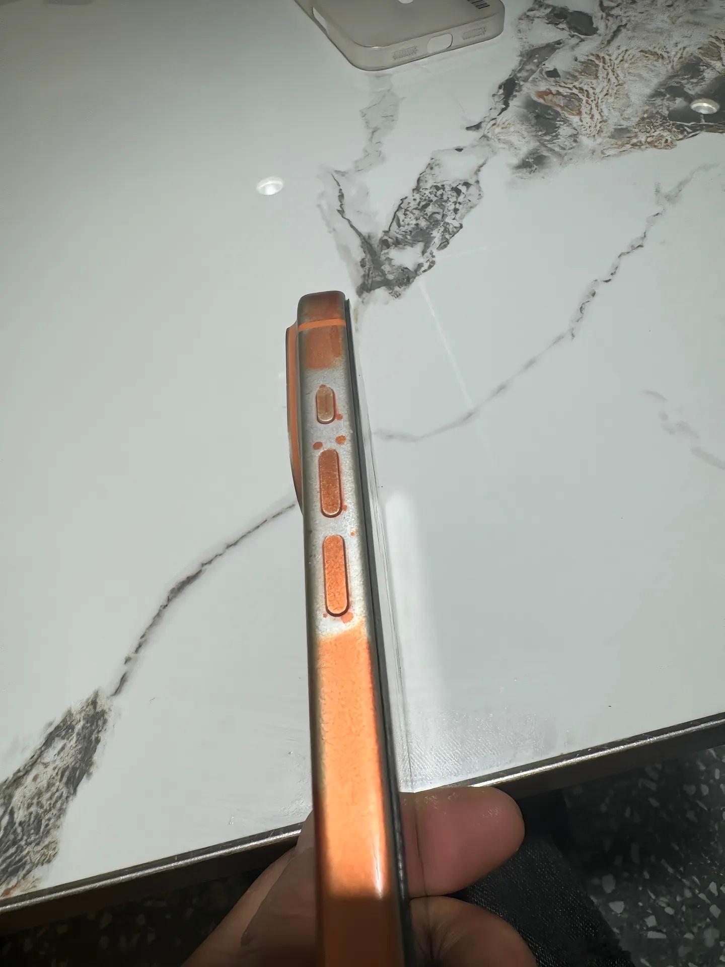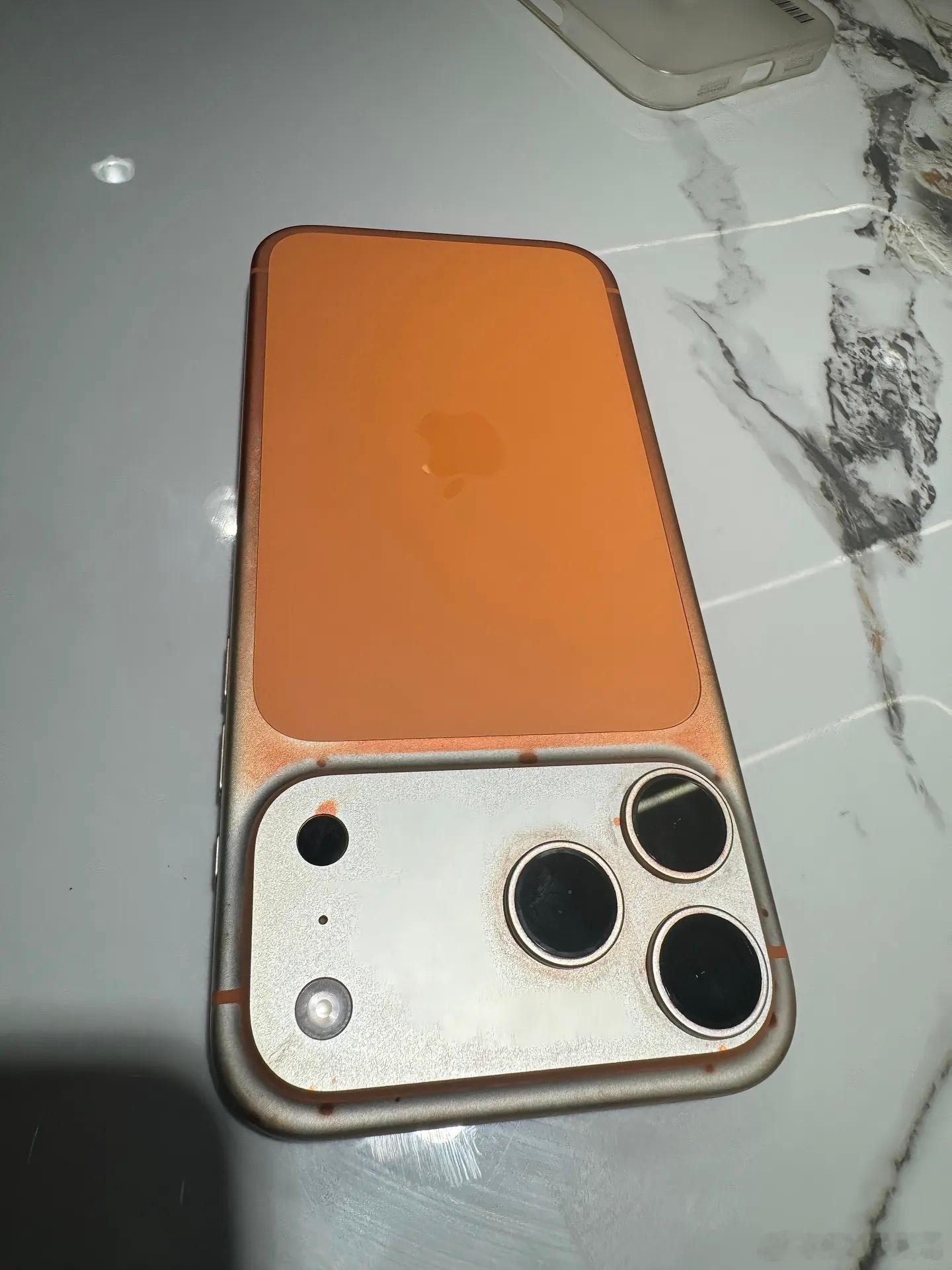 该说不说这应该是目前我见过掉漆最严重的iPhone17 Pro Max,橙色机身都快褪成银色的了,属于花一台手机的钱,体验到了两个新配色,看网友说是用酒精清洁擦过,那也太夸张了,你们感受下吧