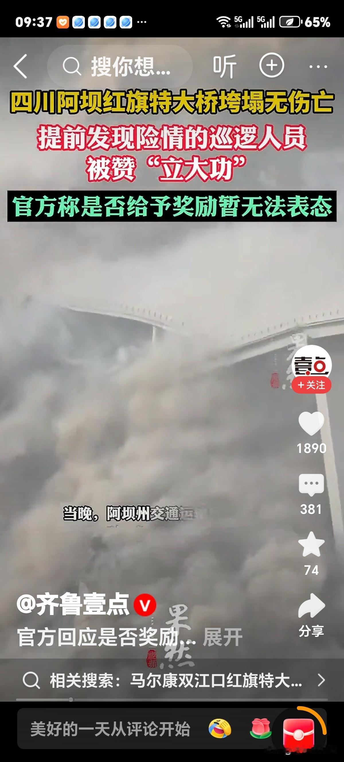 四川阿坝红旗大桥垮塌!给不给予奖励?我真不知道!但我晓得巡逻人员履行了本职工作,做了自己该做的事。毕竟拿工资干活吗。 可我不知道仅运行10个月大桥!怎么会垮塌?此时我忽然又知道,修建此大桥有关人员未有做好本职工作,这我敢肯定!如:设计人员,地质堪探人士,工程施工,材料采购,质量监督及验收人员,总之有某一部门人没有做好该做好的事。我又晓得若是真有人渎职!那笔者可以负责任告诉网友们,渎职者必定受到惩罚,因法律有渎职罪这个名称。 由此可见得出个结论,此事件巡逻人员,应该给矛奖励,并且数额还要大才行,否则不叫奖罚分明。