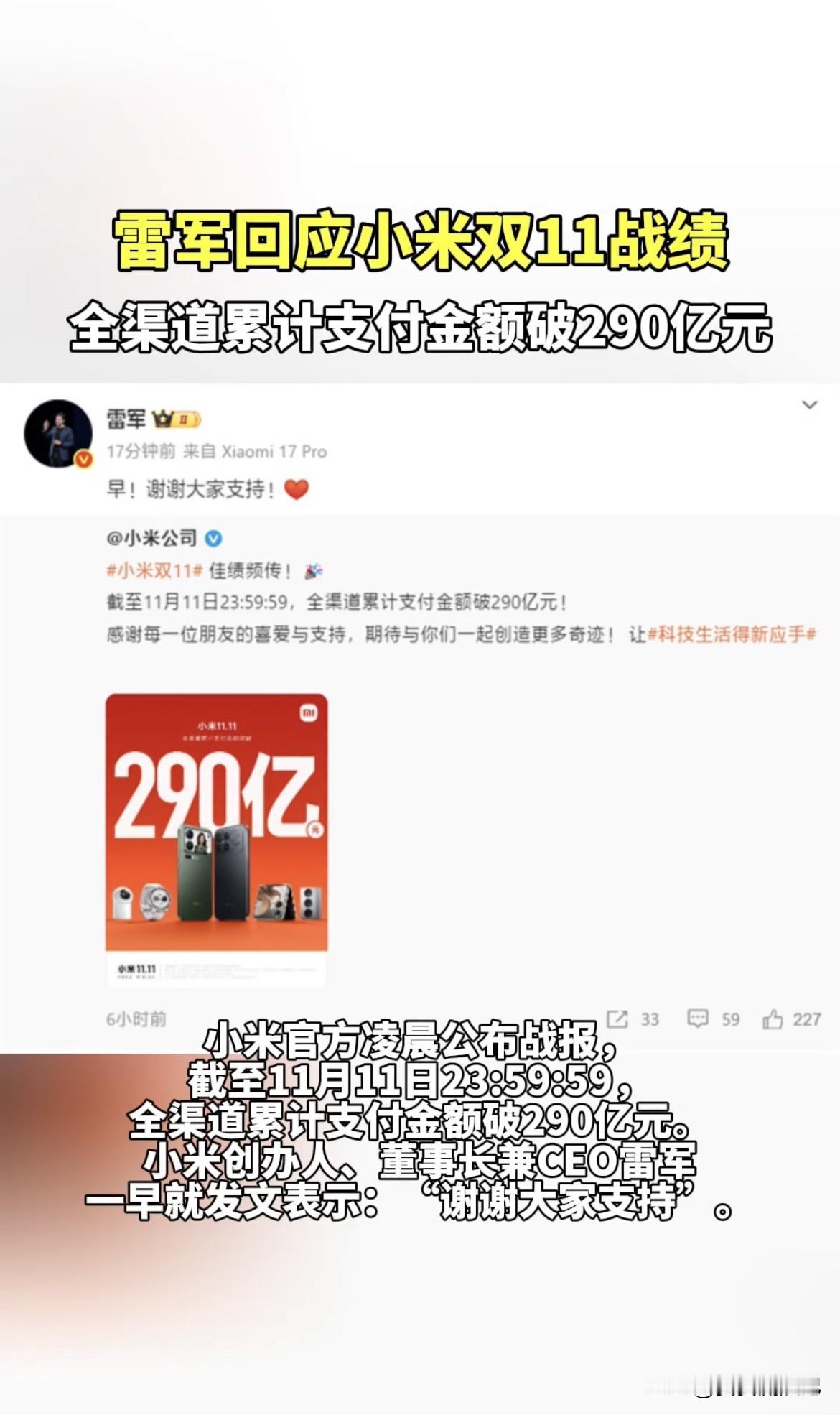 11月12日凌晨小米公布“双十一”战绩,截至11日23:59:59,全渠道累计支