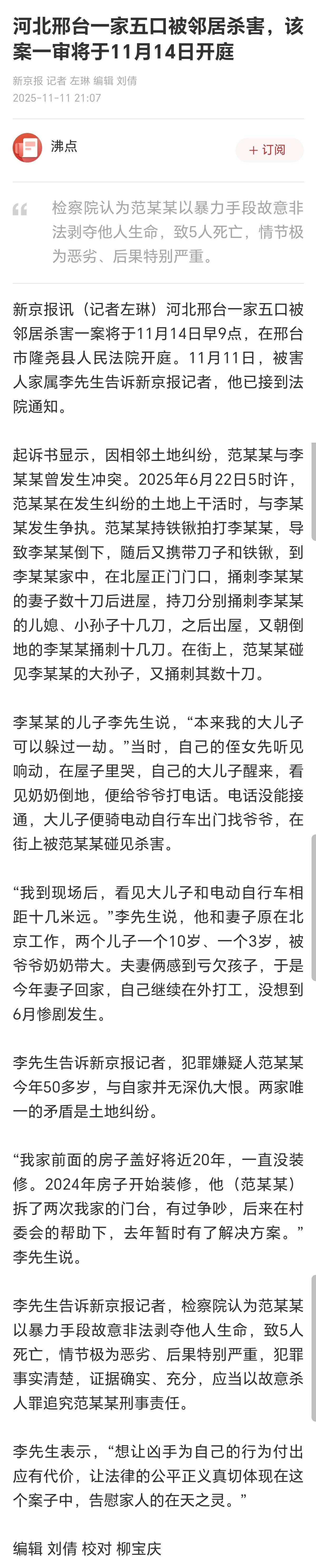 这案子,死刑应该没跑了。因为土地纠纷,即持铁锹和刀子,先后杀害包括两幼童在内的5人。犯罪手段特别残忍,犯罪性质极其恶劣。看报道,本案在中院开庭,以故意杀人罪提起公诉。死刑基本上是板上钉钉了。