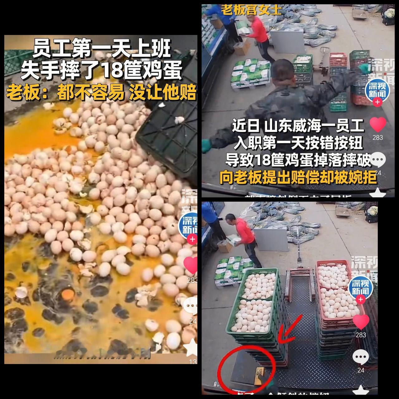 泪目!山东老板一句话暖哭全网 山东威海一商铺,新员工第一天上班,一个操作失误,18筐鸡蛋“哗啦啦”全摔地上了,蛋壳蛋黄撒了一地,看着都心疼!员工急得脸通红,主动说要赔钱。 老板却笑着拍拍他肩膀:“没事,谁还没个新手期?大家挣钱都不容易。” 就这一句话,暖得人鼻子发酸!这年头,还有老板把员工的难处放心上,这样的包容谁能不感动?希望这员工以后好好干,也祝这样的好老板生意兴隆!员工感动瞬间